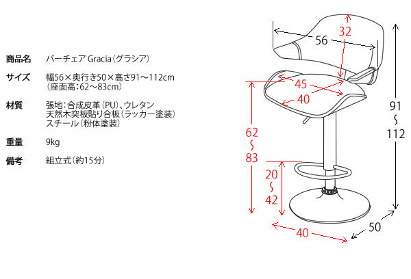 サイズ | 幅56×奥行き50×高さ91~112cm (座面高:62~83cm) |