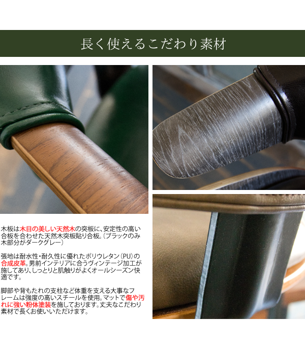 材質 | 張地:合成皮革(PU)、ウレタン 天然木突板貼り合板(ラッカー塗装) スチール(粉体塗装) |
