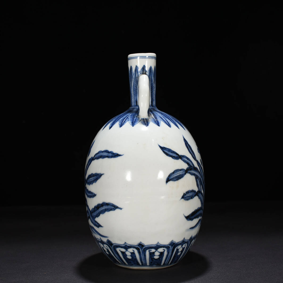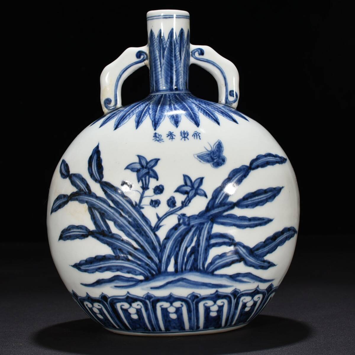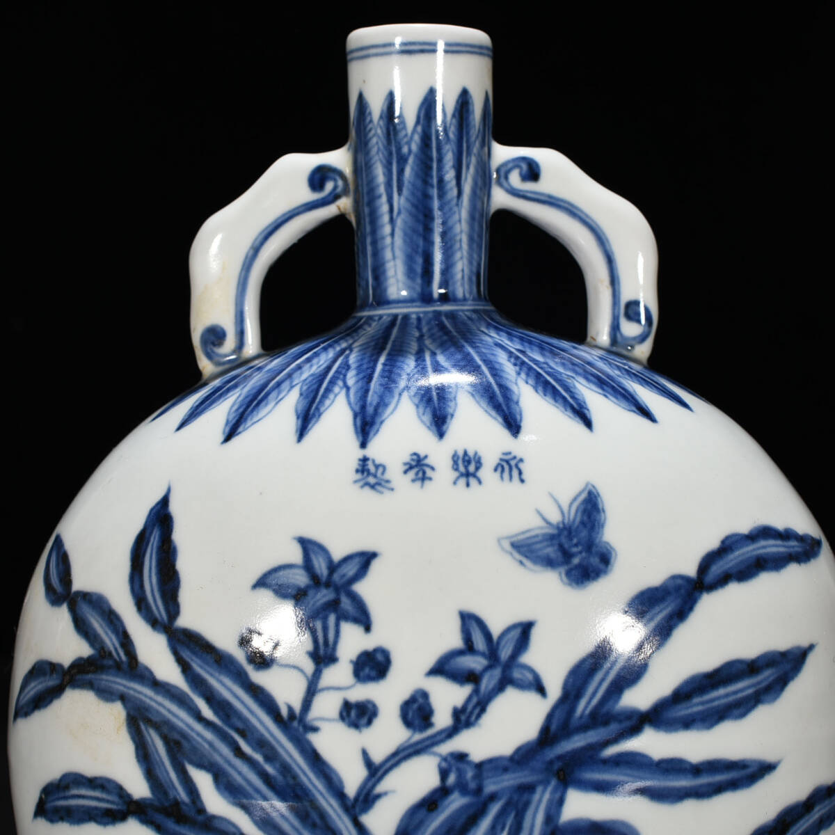 磁器 明時代 永楽年製 サバ萱葺紋 平たい瓶 陶磁器 中国美術 唐磁 時代物 賞物 置物 古美術品 旧藏 骨董品 唐物 xm9.7