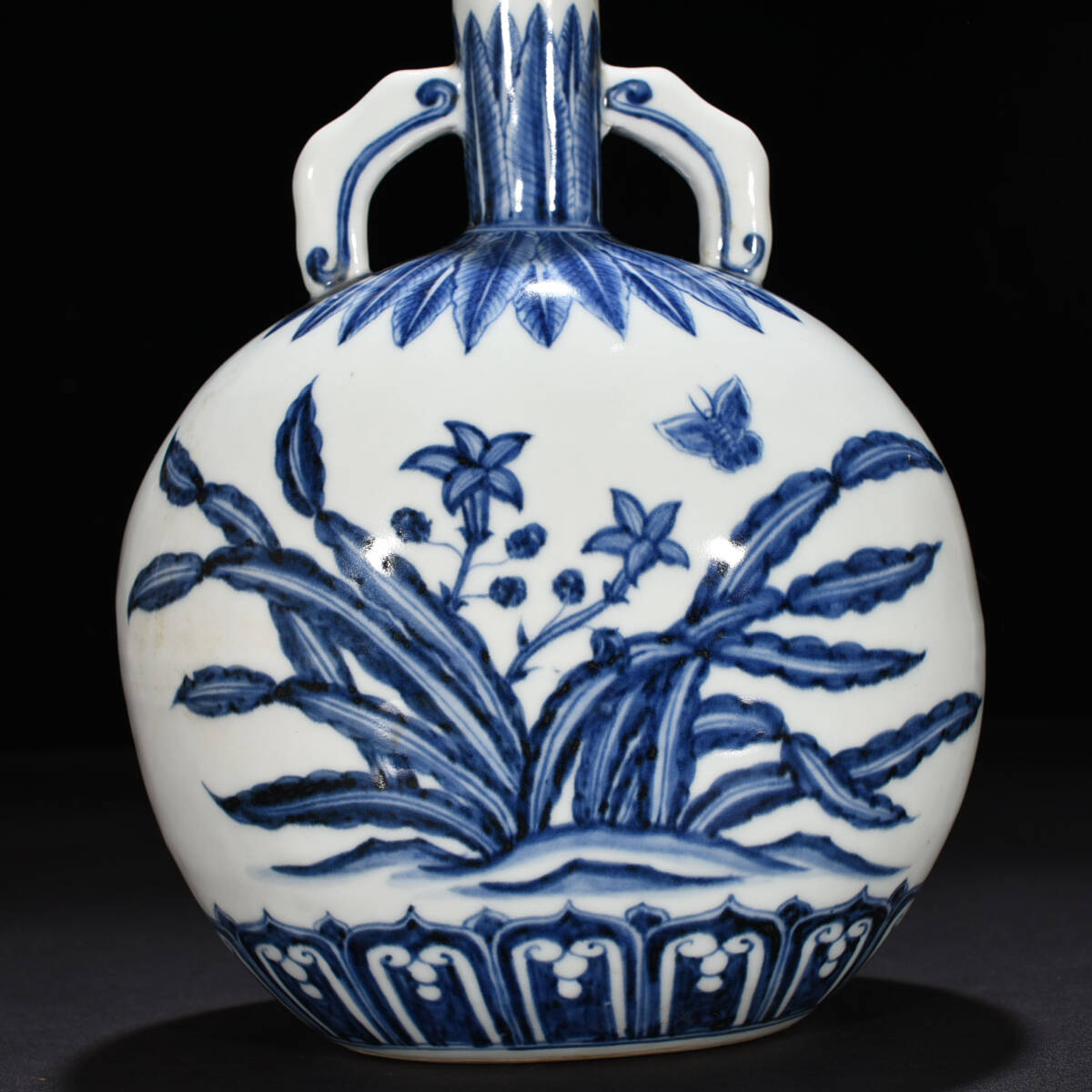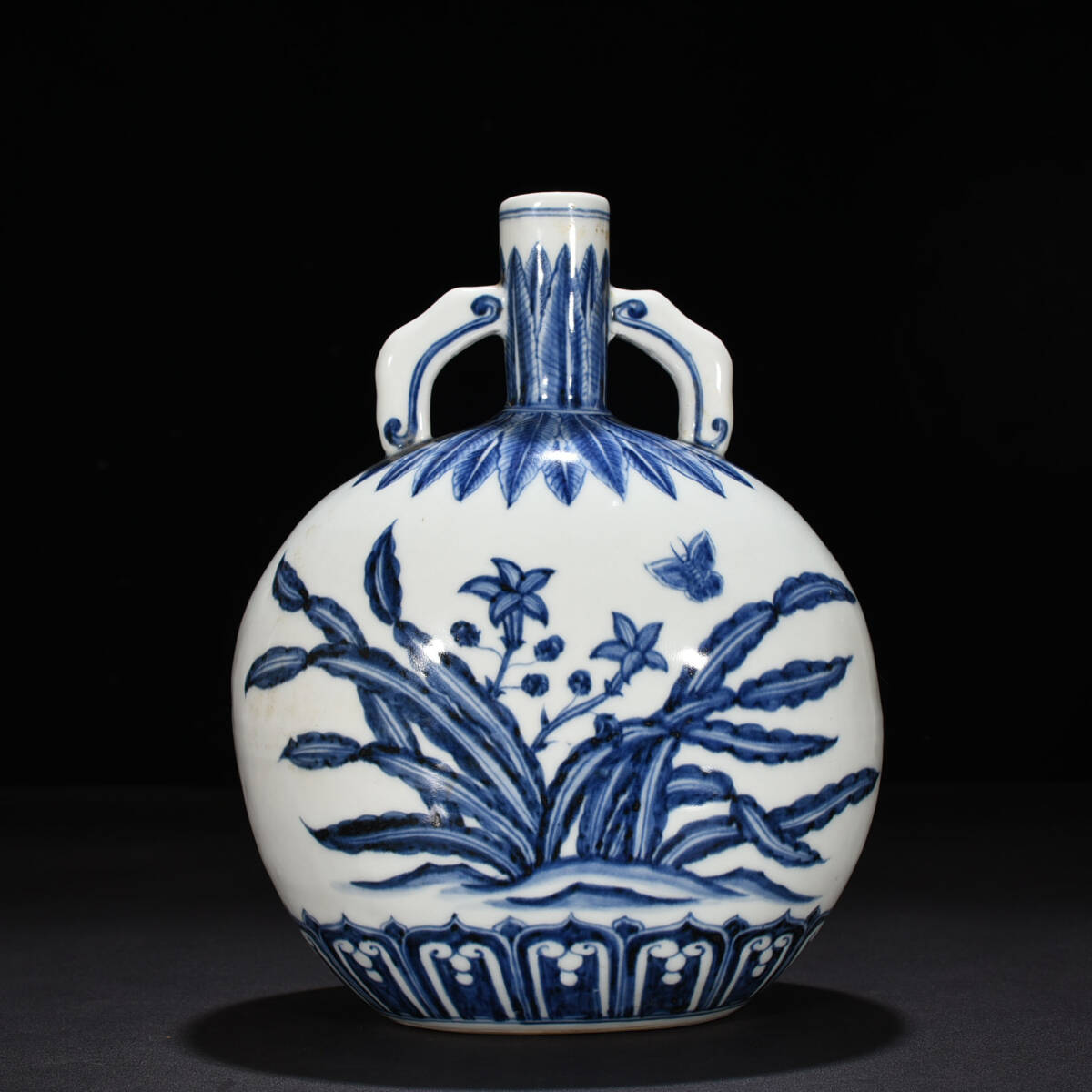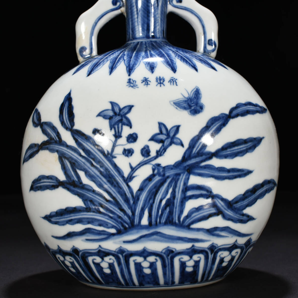 磁器 明時代 永楽年製 サバ萱葺紋 平たい瓶 陶磁器 中国美術 唐磁 時代物 賞物 置物 古美術品 旧藏 骨董品 唐物 xm9.7