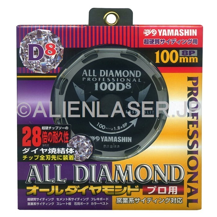 ※モニター(PCモニター・スマホ画面)の発色具合などにより、実際の商品と色が異なる場合がございます。超硬チップソーの28倍の耐久性!ダイヤ焼結体チップ全刃先に装着窯業系サイディングを高品質ダイヤモンドチップで美しく快適にカット!静音・制振レーザースリット入りでさらに切断性能がUPしました。CYT-YSD-100D8外径100mm中心穴径20mm切削幅(刃厚)1.8mm刃数8P最高使用回転速度Nmax13,000rpmレーザースリット有適合機種集じんマルノコ※モニターの発色具合により、実際のものと色が異なる場合がございます。