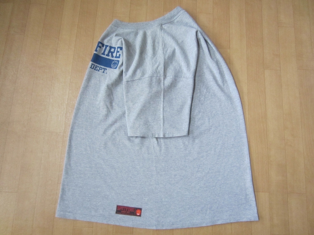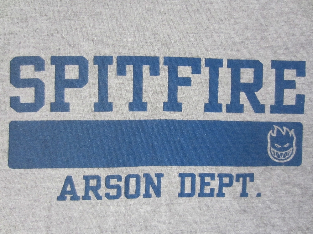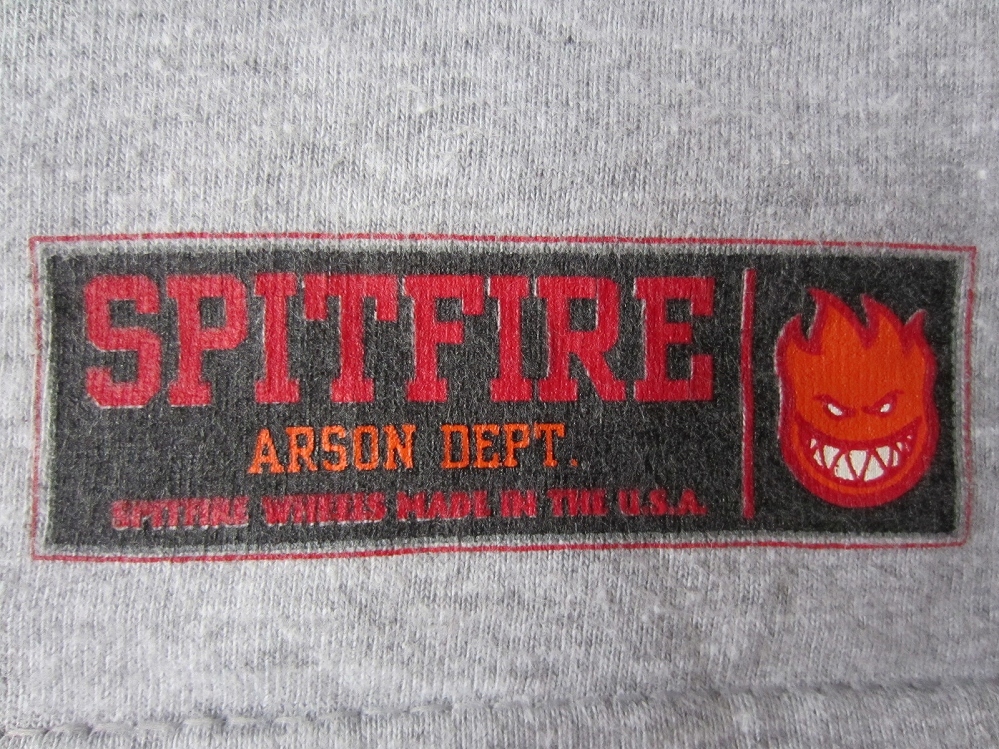 1987年に、アメリカ・サンフランシスコで、「REAL SKATEBOARDS(リアル・スケートボード)」、「ANTIHERO(ANTI HERO/アンチヒーロー/アンタイヒーロー)」、「KROOKED(クルキッド)」、「Thunder TRUCK(サンダー・トラック)」、「Venture Trucks(ベンチャー・トラック)」等のスケートボード用品のディストリビューションを行う「Deluxe Distribution(デラックス・ディストリビューション)」内に設立され、アメリカ・ニューヨーク州・ラファイエットストリートで「James Jebbia(ジェームス・ジョビア)」氏によって、1994年に設立された老舗ストリート・ウェアブランド「SUPREME(シュプリーム)」と2018年春夏(2018 SPRING-SUMMER/2018SS/18SS)コレクションにてコラボレーションしたことでも知られる、世界で最も有名でいて、シェアナンバー1を誇るウィールブランド、〔SPITFIRE(スピットファイア/スピットファイヤー)〕の、Tシャツ前面のフロント付近に、古き良き時代の「アスレティックウェア(Athletic Wear)」、「カレッジ・スタイル(College Style)」へのオマージュを感じさせる「SPITFIRE [  火の玉ロゴ] ARSON DEPT.」3段カレッジロゴのプリント、左手側の下部・裾上付近に「SPITFIRE ARSON DEPT. SPITFIRE WHEELS MADE IN THE U.S.A. 火の玉ロゴ」ボックスロゴ(Box Logo)のプリントが施された、メキシコ製(Tシャツの生地・アメリカ製、生産国(縫製)・メキシコ製)の旧「Hanes(ヘインズ)」社の「BEEFY-T(ビーフィー)」ボディを使用した、〔オールド(Old/Vintage/ヴィンテージ/当時物)・3段カレッジロゴ・旧Hanesボディ・Tシャツ〕になります。
