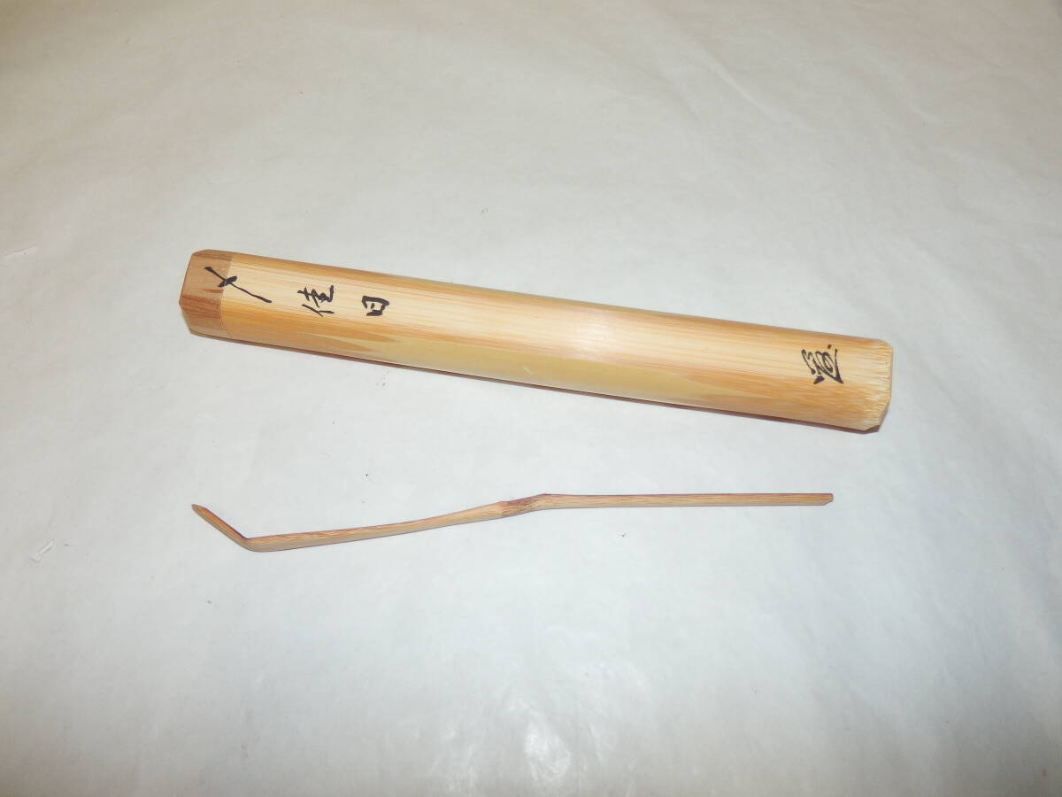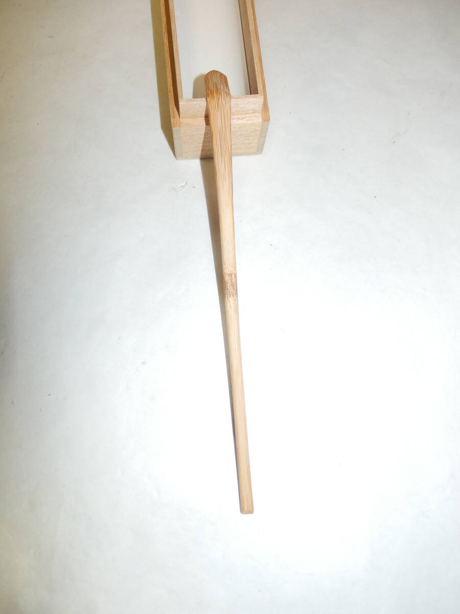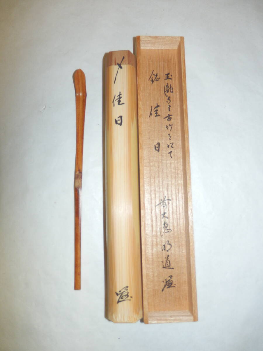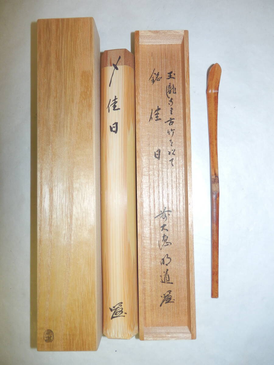 「茶道具」前大徳の玉龍寺の戸上明道さんの有馬山型の茶杓です。銘「佳日」です。 玉龍寺の古竹で造られています。茶杓長さ約18.8cm 桐共箱「ヤケ、シミ等有」。 どうぞ宜しく。