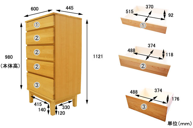 中(2/3/4段目)引き出し内寸:幅488×奥374×高118