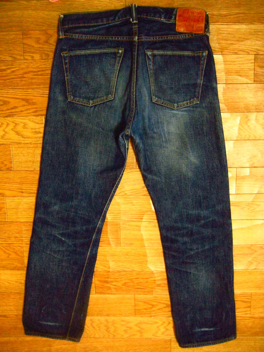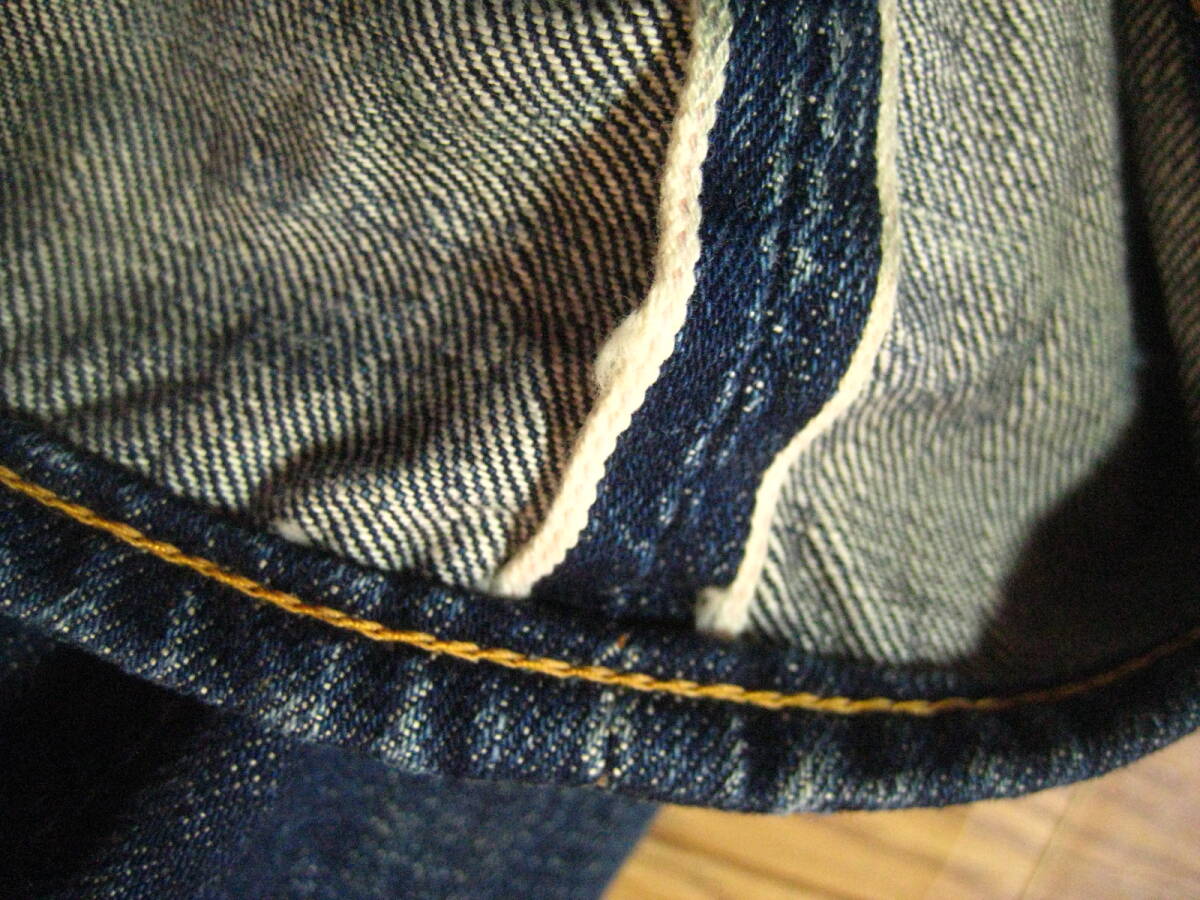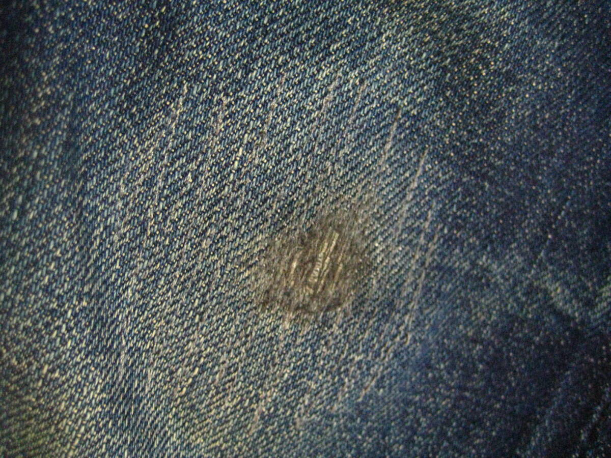 。○●サイズ表記●○。 W30L3? ボタンフライ 。○●平置きで実寸サイズ●○。 ウエスト約76㎝、レングス約69㎝、裾幅約18.5㎝ 太もも幅約29cm、股上前約28㎝、総丈約94㎝ ●程よい色感になります。 ●革パッチ・隠しリベット・ウエストバンドとバックポケットの縁はシングルステッチ・Vステッチ・各セルビッジ・裾はチェーンステッチなどなど。 ●濃紺極上の風格、しっかりとしたメリハリ感、ヒゲ・アタリ・タテ落ち感もこれから楽しめる1本になります。 ●実にカッコいいパンツになっております。激安で出品いたしますのでぜひこの機会にどうですか!!!