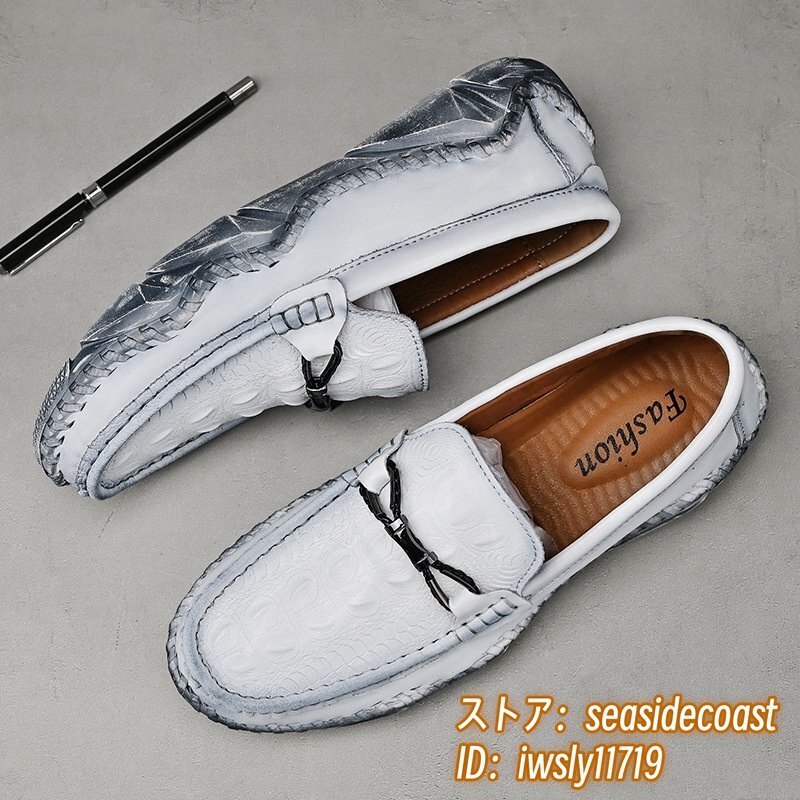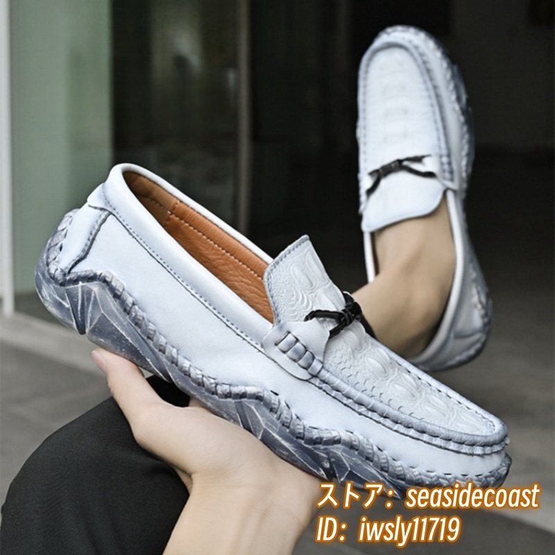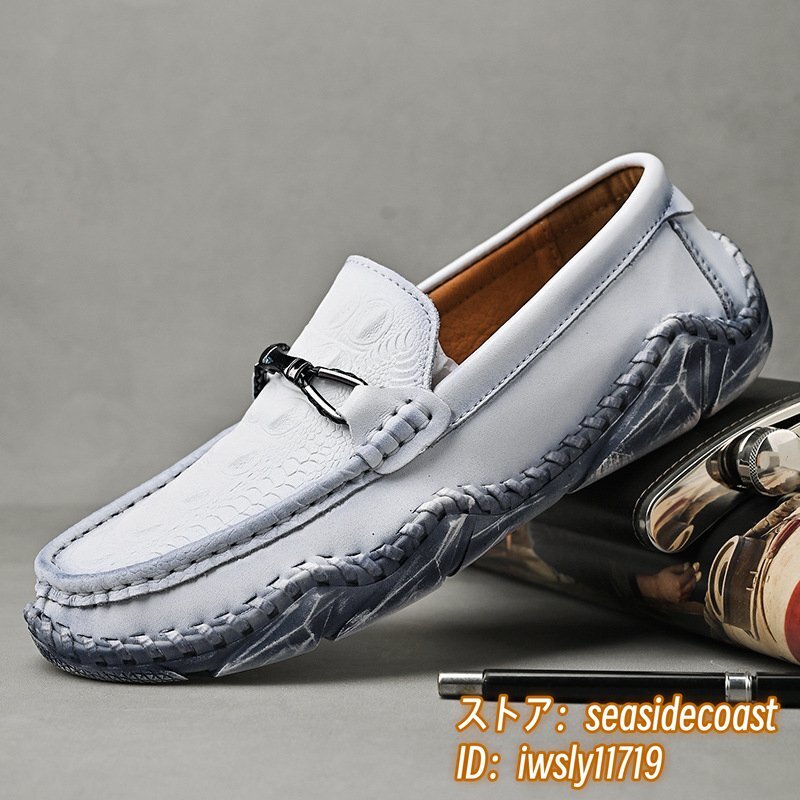 超美品★本革 ローファー スリッポン 新品 メンズ レザーシューズ 牛革 ビジネスシューズ ドライビングシューズ 紳士靴 白/灰 25.0cm