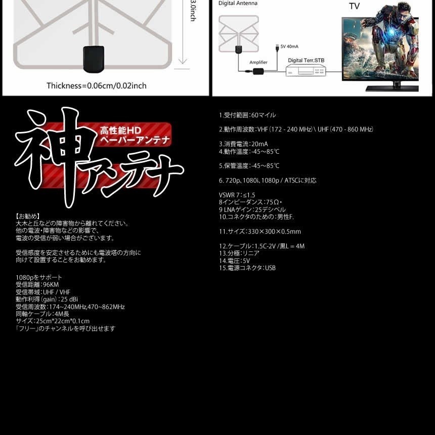 | 送料無料!!! 送料及び下記のご案内をご確認の上、ご入札お願い致します。 離島地域を除く九州、四国、本州まで送料無料。 ※北海道は+1000円、離島地域及び沖縄県は+3000円にて承ります。(発送前に加算) ※画像内にカラー及びサイズ等の選択が可能と記載がある場合がございますが、 お届けする物はタイトルまたは商品説明文に記載の物です。 ★※注文後のカラー変更や異なるカラー・サイズ指定等は一切承っておりません。 ※★※仕様(ロゴデザイン/ロゴ有無等も含む)は予告なく変更する場合があります。 ※多少の汚れや小傷がある場合がございますがご了承ください。 梱包は簡易包装ですので、箱の角落ち等はご了承願います。 ======================================= 【薄型室内用アンテナ】 本商品の厚さわずか0.6mmと薄型軽量設計で 曲面と平面を問わず壁と窓さえあればどんなところでも設置できます。 例えば、カーテンの隙間、本棚の上、窓の内側 目立たない壁際などのいろいろなところにアンテナを簡単に取り付けることができます。 受信感度を安定させるためにも電波塔の方向に向けて設置することをお勧めます。 ※受信が十分でない場合は設置場所を変更し、調整を行って下さい。 ブースターに電源ランプが付いてるので通電が一目で確認できます。 ======================================= 1080pをサポート 受信距離:96KM 受信帯域:UHF / VHF 動作利得(gain):25 dBi 受信周波数:174~240MHz,470~862MHz 同軸ケーブル約:4M長 サイズ約:25cm*22cm*0.1cm ======================================= ![]() ![]() ![]() ![]() ![]() |