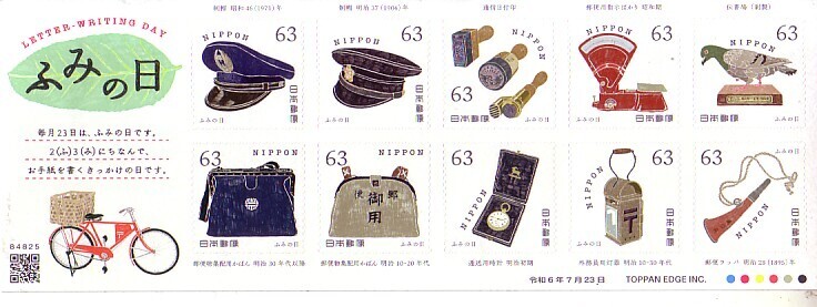 「ふみの日 Letter Writing Day 令和6年」の記念切手です (63円切手X10枚)。送料は普通便110円(郵送 複数落札でも同一料金)になります。