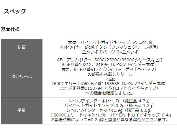 ABU アンバサダー1500C、1600C、2500C、2600C、3500Cシリーズ用の軽量レベルワインダーです。素材に軽量な金属を採用しており、本体とパイロットガイドキャップはアルミ合金製、本体ワイヤー部分は純チタン製です。このため、純正品に比べ約3分の1の重量となり、キャスト時の運動抵抗の軽減が期待できます。 ワイヤー部分にはラインにやさしい浸炭処理を施しております。高硬度で耐摩耗性、耐食性に優れており、PEラインの使用も問題ありません。 ■重量:1.9g(ABU純正品:6.0g) ※2600Cエリートは本体:1.9g パイロットガイドキャップ:0.4g ※製造時期によって±0.2gほど重量が異なる場合がございます。 ■適合機種:ABU アンバサダー1500C,2500C,3500Cシリーズなどの純正品番10212、21896(レベルワインダー本体)また、純正品番5177(パイロットガイドキャップ)の部品を搭載したリール ※2600Cエリートの純正品番1153555(レベルワインダー本体)また純正品番1153794(パイロットガイドキャップ)への適合を確認しました。 ※こちらの商品は実店舗、GIZMOヤフー店、ヤフオク店併売となります。時間差で売り切れの際はご容赦ください
