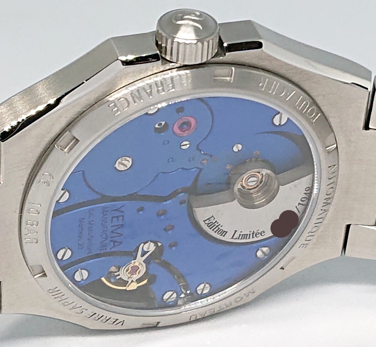 1948年創業のフランスのブランド イエマ。未使用品となります。2023年に1948本限定で発売された貴重なモデルで、マイクロローターにはシリアルナンバーが刻印されております。裏蓋がシースルーのためイエマ自社製のムーブメントを拝見できます。