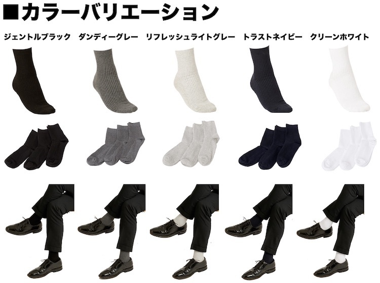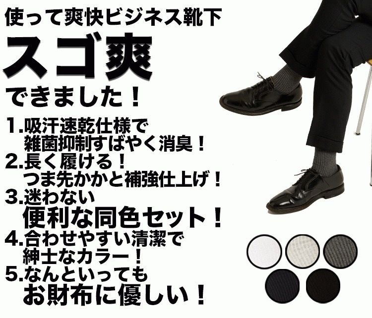 | ■■■店長のコメント■■■ ■使って爽快ビジネス靴下「スゴ爽」できました! 1.吸汗速乾仕様で雑菌抑制すばやく消臭! 2.長く履ける!つま先かかと補強仕上げ! 3.迷わない便利な同色セット! 4.合わせやすい清潔で紳士なカラー! 5.なんといってもお財布に優しい! ■ウミネコが求めたものとは・・・ 一、「よし!蒸れてない!」座敷デートや飲み会でも安心の速乾消臭効果が欲しい。 一、穴あきで恥ずかしい思いはもうしたくないッ。。。つま先とかかとへの十分な補強が欲しい。 一、スーツに合う、そしてカジュアルにも合う、どうせなら自信が湧くくらいシンプルでスタイリッシュな方がいい。 一、「靴下片方どこいった!?」に終止符を!これ以上、片方の靴下探しで朝の貴重な時間を無駄にしたくない! 一、そしてこれらのこだわり機能がお財布に優しく手に入れられること。 ウミネコの商品はこれらを【全てクリア】いたしました! ■吸汗速乾生地で抑菌消臭!座敷デートや飲み会でも安心の防臭効果 足の悪臭の原因の一つである汗。そして汗による蒸れで、靴下内は雑菌の絶好の増殖環境となります。 本靴下は雑菌の増殖の原因となる汗蒸れを解決! 吸汗速乾特性のある生地により、従来品に比べ、効果的に汗を吸い取り、歩くごとに呼吸するように乾燥を促していきます。 これにより靴下内環境の蒸れを解消し、雑菌の繁殖を抑え、ニオイが発生しづらい環境を作ることができました。 また、その通気性とよく乾きやすい生地により、足元を清潔に保ちます。 肌触りの良い生地は程よい厚さに仕上げ、乾きやすいからお洗濯も楽ちん! メリットを沢山感じて頂けるような仕様に仕上げております。 ■『つま先』と『かかと』も十分に補強しました!! 座敷に上がろうとして「あ!!穴が空いてる(汗)」なんていうご経験は誰しもあるかと思います。 これは地味に恥ずかしい気持ちになりますよね。 穴の空いたつま先をつまん伸ばして、隠してみたりしますが、その行動は怪しく見えますし、やはり穴は隠しきれません。 耐久性の高い靴下だったら良かったのに・・・。 ご安心ください!本靴下はつま先、かかとを強化して破れにくく仕上げております! 貴方の超アクティブな外回り仕事においても、きっと優秀な相棒となってくれることでしょう! ■「靴下片方どこ?」から開放されます! そう、便利な同色セットだから! バタバタと忙しい朝の準備。 「あれ、靴下片方どこ行った?も探しても見つからない。」 「しょうがないから別の靴下にしよう・・・こっちも靴下片方どこ行った?」 こんな経験ありませんか? 朝からイライラして気分も嫌になりますよね! 本靴下ならもう大丈夫! 同色セットでの販売となっておりますので、悩む必要も無くセットの中からササッと2足選べば良いのです! これで朝の靴下捜索大作戦から開放されます! だから、 ・片方洗い忘れても ・片方無くしても ・片方サンタさんに使っても いつでもすぐに、必要な2足を 選び出すことが出来るのです! これで選択疲れのストレスも大幅軽減!脳もリフレッシュ!キリッと軽快に出勤しちゃってくださいね! ■自信が湧くほどシンプルでスタイリッシュなデザイン! スーツに合うのはもちろん、カジュアルスタイルにも合わせられるように、 シンプルでスタイリッシュなデザインに仕上げました。 やはり、オシャレは足元からですね。 本靴下は『気取らない、でもただの靴下ではない高貴な存在感を持つ清潔な靴下』というコンセプト。 また、色は合わせやすいカラーだけをご用意しました。 年齢問わず、スタイリッシュに着用することができ、どれをはいても隣の紳士にナチュラルに差をつけることができます。 ■お財布にとっても優しくご提供が可能となりました! 「でもこれだけこだわりの靴下だからお高いんでしょ?」 いえいえ!大丈夫です! 今回もウミネコの商品企画開発部門頑張りました! ・工場直取引! ・問屋を通さない! ・流通の最適化! ・徹底的なシステム化! などなど、 あらゆる工夫を徹底的に行い、 大幅なコストカットを実現! こだわりのある靴下ですが、 お財布にとても優しくご提供することができるようになりました! ありがたいことにリピーター様も順調に増えております! ぜひぜひお試しくださいね! ■■■仕様詳細■■ ■サイズ フリーサイズ ※快適着用サイズ25cm-28cm ■機能やメリットなど ・吸汗速乾記事によるムレ防止・抑菌・防臭。 ・通気性と肌触りの良い生地で快適な着用感。 ・選択疲れの無い同色セット。 ・つま先・かかとの十分な補強。 ・隣の人に差がつくシンプルスタイリッシュなデザイン。 ・どんな服にも合わせられるカラーバリエーション。 ・大幅コストカットでお財布に優しく手に入るこだわりの機能。 ■用途 ビジネス、フォーマル(冠婚葬祭)、スーツ用、カジュアル、普段履き。 リクルート、就職活動、新生活、父の日、日頃の感謝や誕生日などのプレゼントにも大変喜ばれています。 ■生地 綿72% ポリエステル