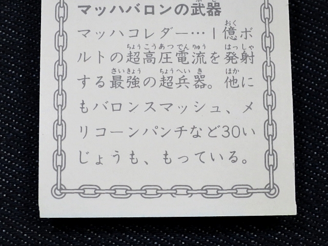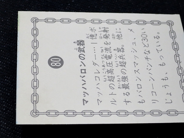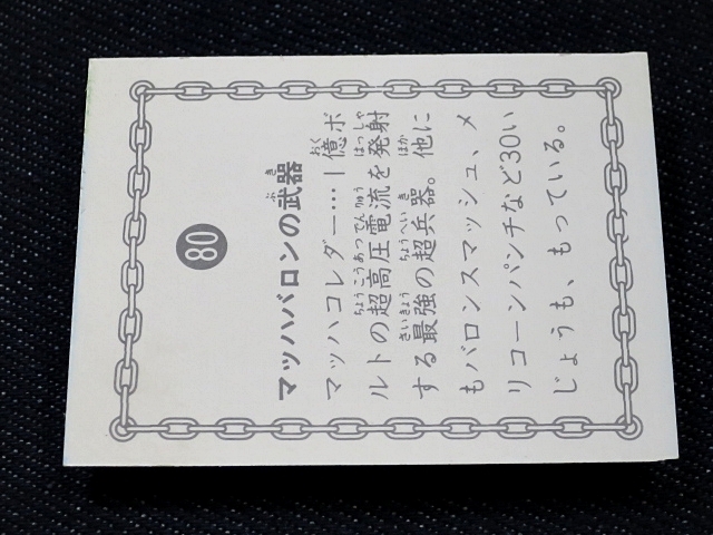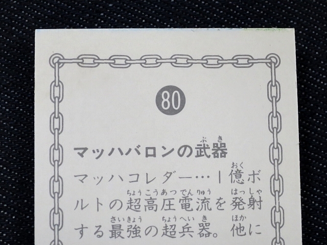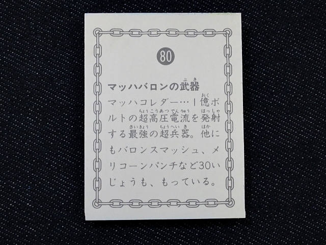 スーパーロボット マッハバロン ミニカード バラ売り 1枚 ・メーカー:天田(Amada) ・サイズ: 6.5 cm x 5.0 cm ・販売時期:1974年頃に駄菓子屋にて発売されていた商品です。 ・構成:61-120(2弾.60種・AL2連タイプの3種 シリーズ) ・同梱発送可能 〓参考項目〓 ・脚本:上原正三、井上知士、山崎晴哉 ・監督:鈴木清高、野宏一、鈴木俊継、山本正孝、前川洋之、浜しんぎ ・プロデューサー:安田暉、川口晴年、上田利夫、上村宏 ・制作:日本テレビ ・放送期間:1974年10月7日 - 1975年3月31日 ・話数:全26話 〓出演者〓 ・嵐田陽:下塚誠 ・小杉愛:木下ユリ ・岩井明:力石孝 ・白坂譲司:加藤寿 ・小杉健一:内海敏彦 ・村野博士:団次郎 ・花倉刑事:深江章喜 ・ララーシュタイン:伊海田弘 ・タンツ陸軍参謀:麿のぼる ・スーカン海軍参謀:所雅樹 ・ゲラー空軍参謀:桜木栄一(1~8話)、木村章平(9~22話) ・ゲラーの声:木村章平(7・8話) ・マッハバロン:中山太郎 ・敵ロボット:遊佐知幸 ・ナレーター:岸田森 | ||