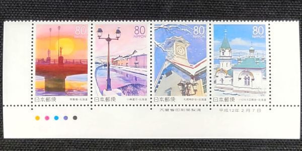[24102121] ふるさと切手【北海道・雪世界Ⅱ】4種連刷 銘版CM付「幣舞橋・小樽運河・札幌時計台・ハリストス正教会」80円×4 2000年