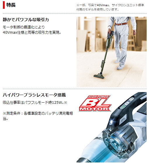 吸込仕事率はパワフルモード時125W。※測定条件:各標準設定のバッテリ満充電相当。
