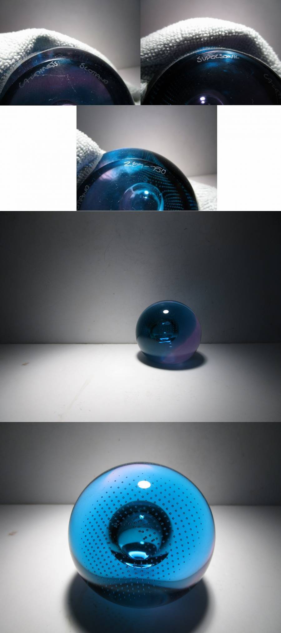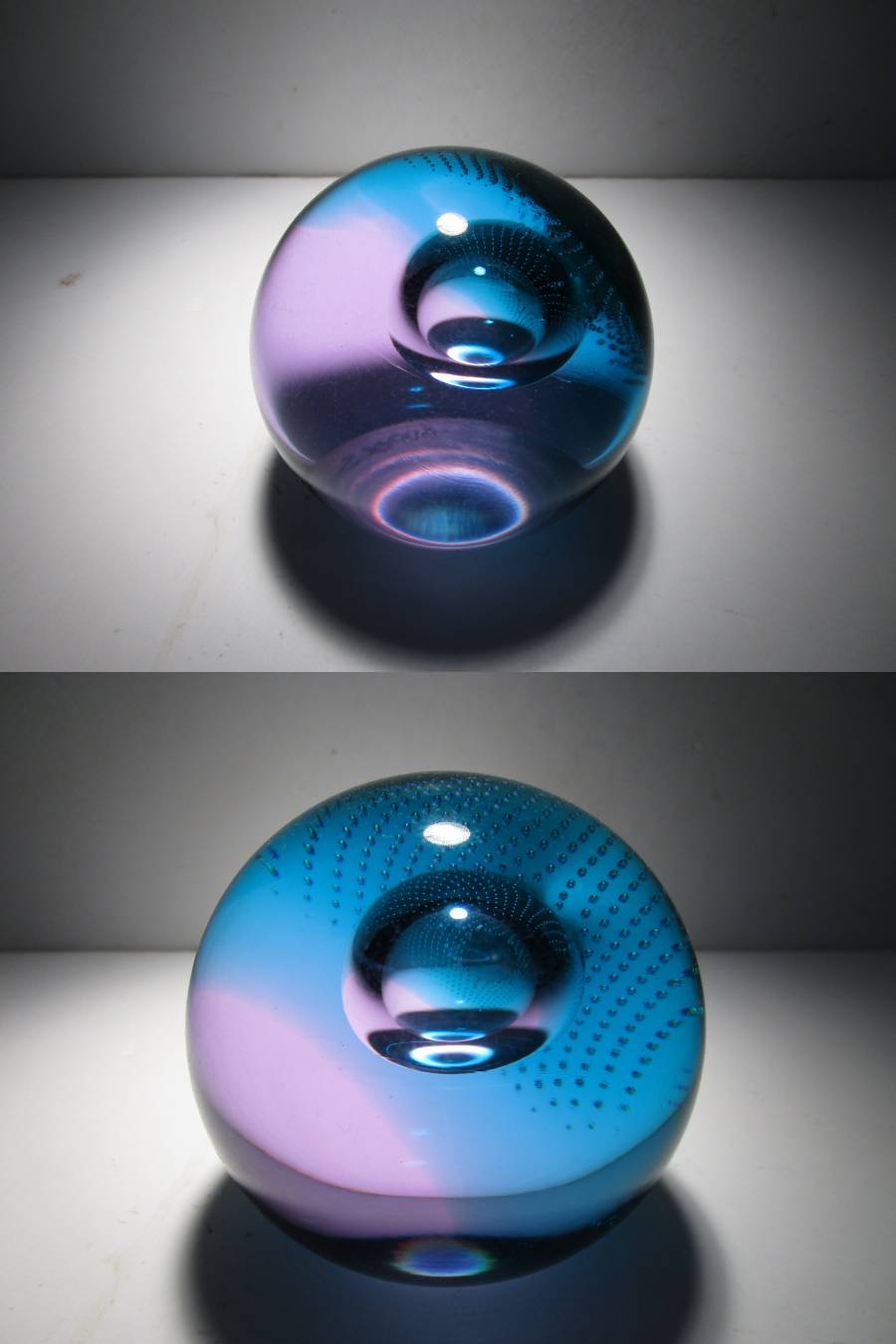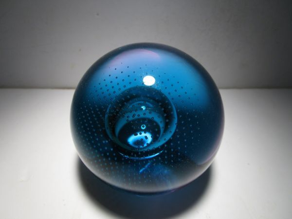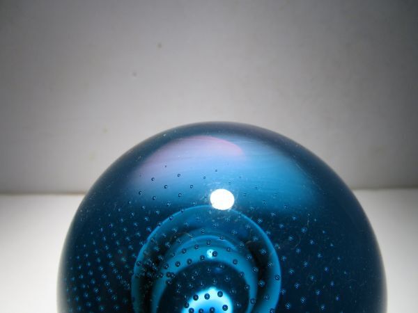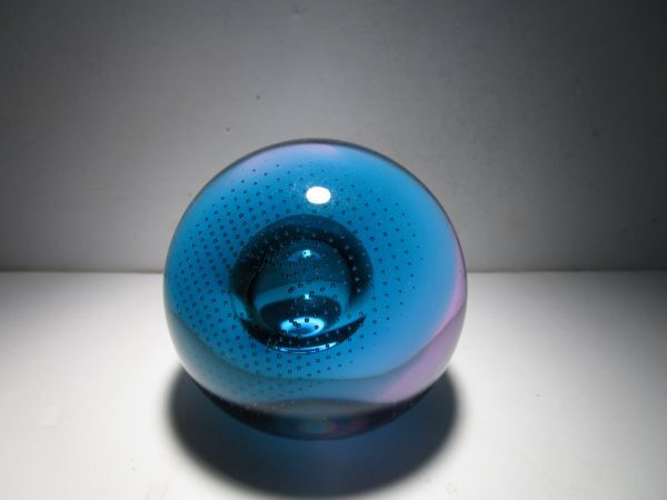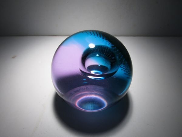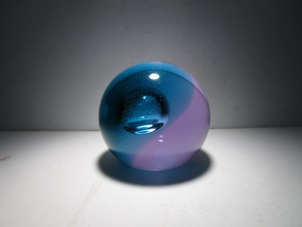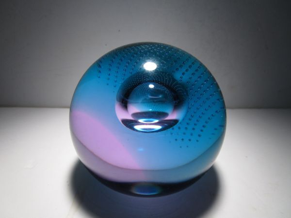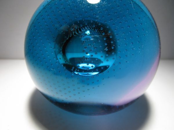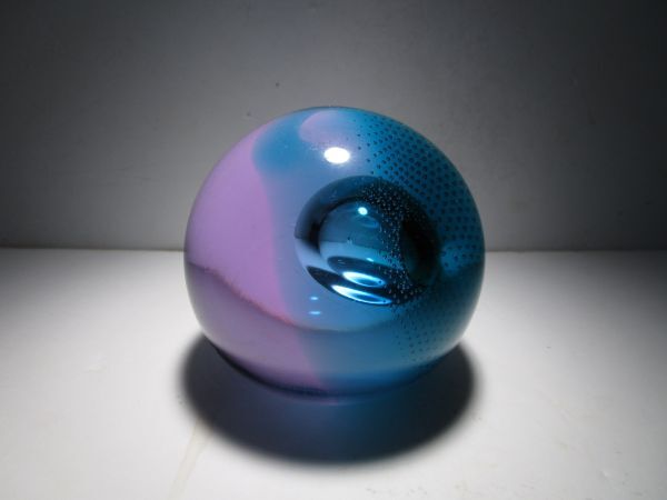 SuperSonic(超音速)という名の作品。作品名とデザインの関連性は不詳ですが、深みのあるターコイズブルーとパープルの合わせガラスのオーソドックスな球体の中央の大き目の気泡、その気泡を包み込むように広がる細かなコントロールバブルの気泡、それらの織りなす造形が幻想的な印象の作品です。ごくシンプルなデザインながら、ぱっと見以上にかなり凝ったしつらえを施された1品で、見る角度、光の加減で様々な表情をみせてくれる魅力的な作品です。