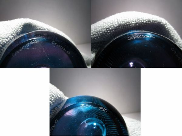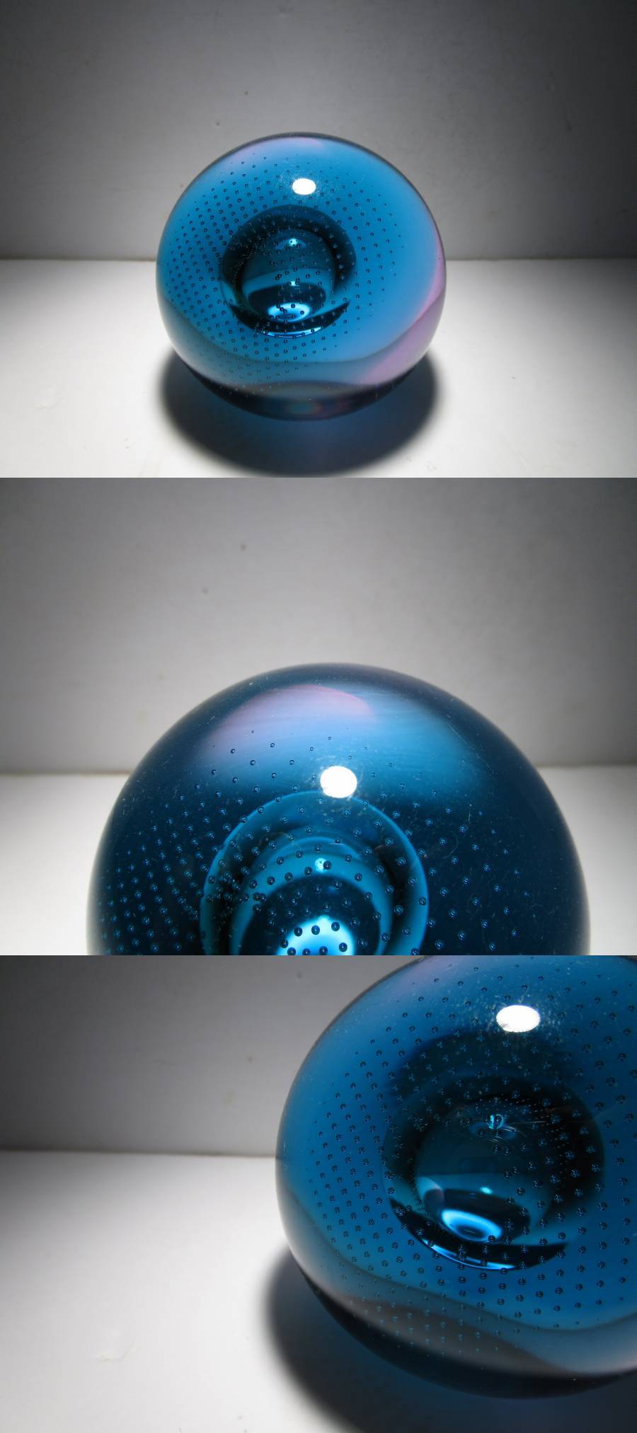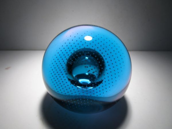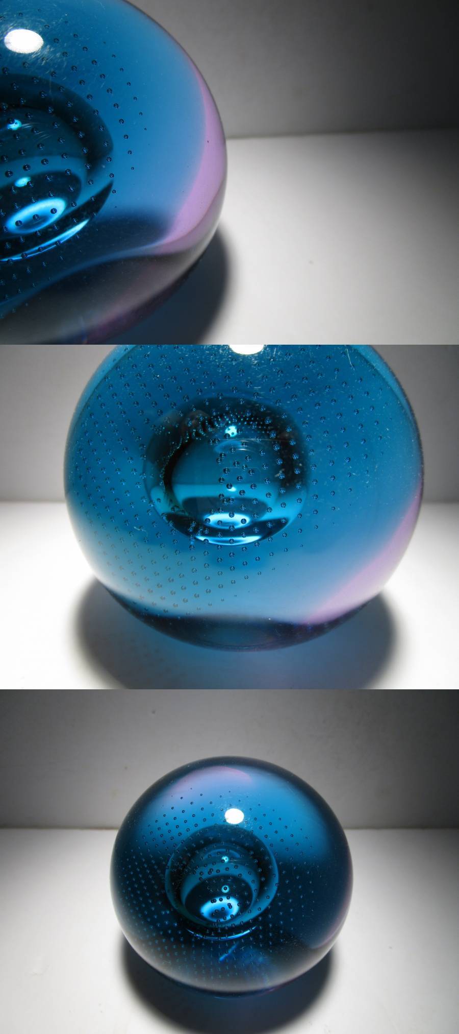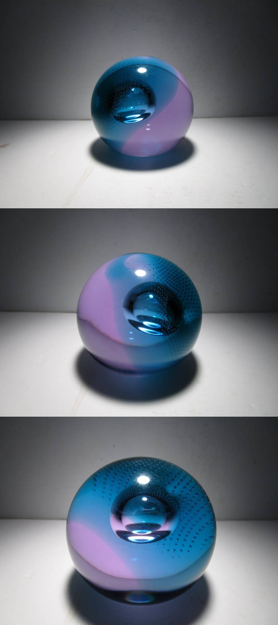 SuperSonic(超音速)という名の作品。作品名とデザインの関連性は不詳ですが、深みのあるターコイズブルーとパープルの合わせガラスのオーソドックスな球体の中央の大き目の気泡、その気泡を包み込むように広がる細かなコントロールバブルの気泡、それらの織りなす造形が幻想的な印象の作品です。ごくシンプルなデザインながら、ぱっと見以上にかなり凝ったしつらえを施された1品で、見る角度、光の加減で様々な表情をみせてくれる魅力的な作品です。