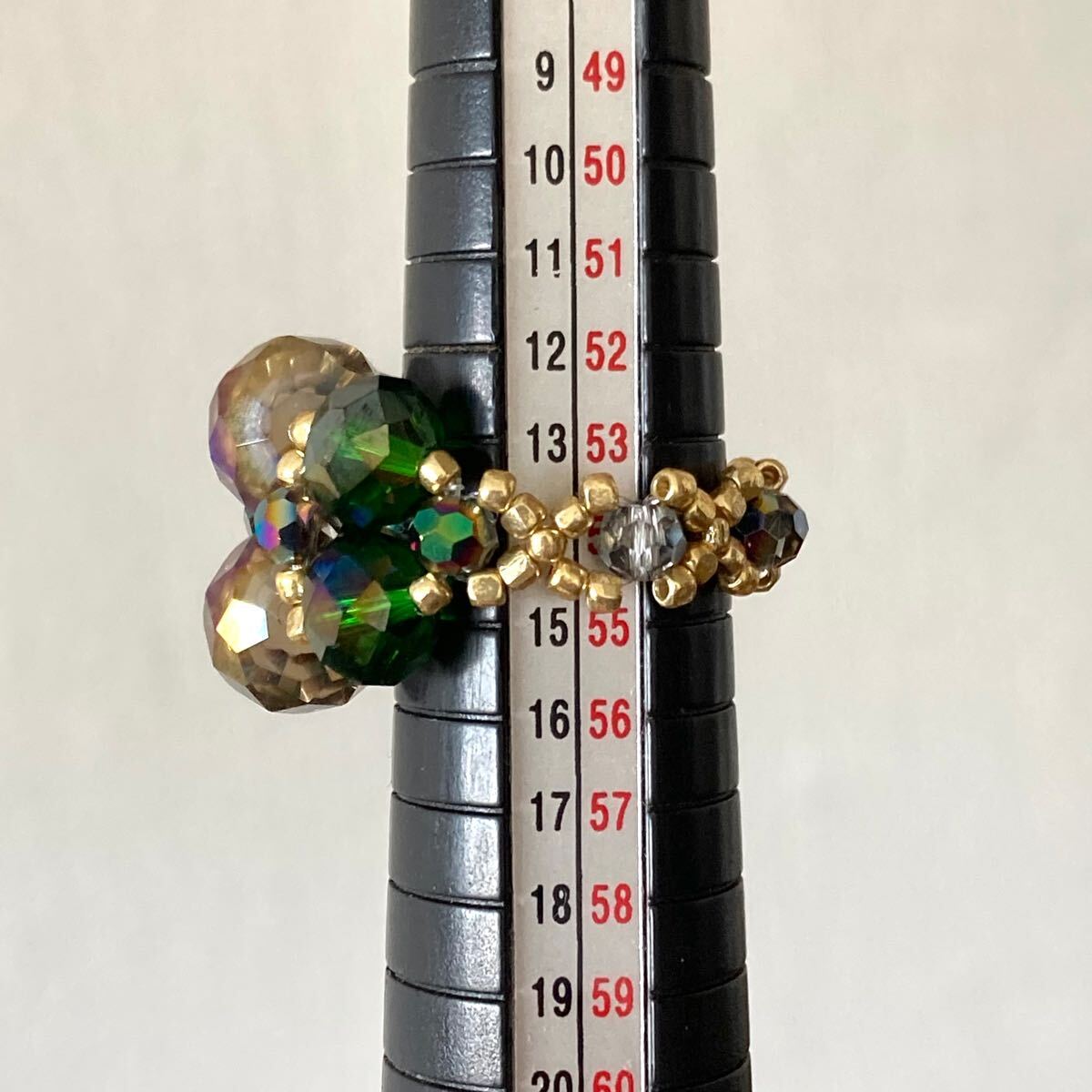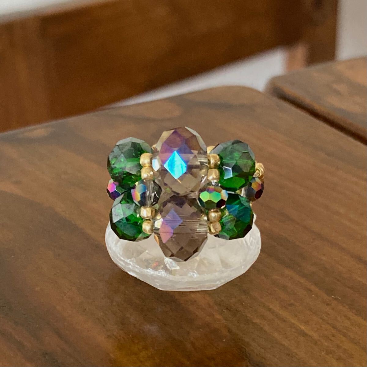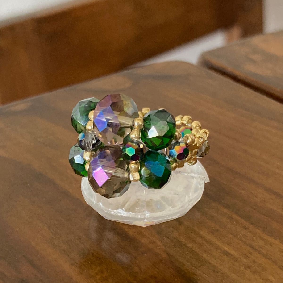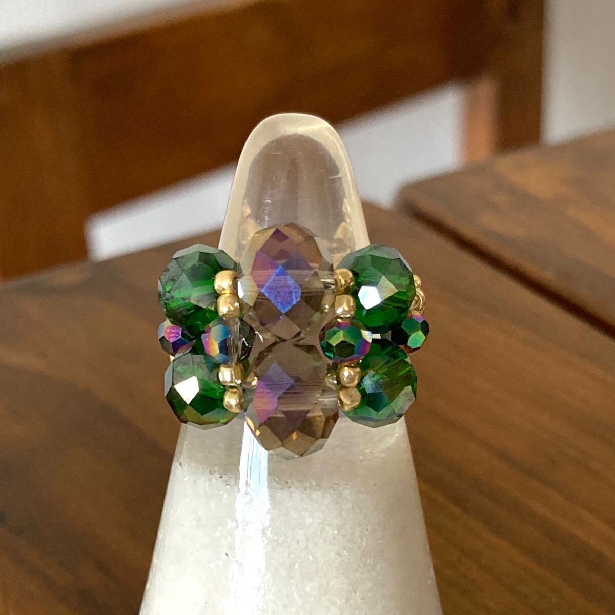 10mmのグレージュ、8mmのグリーンのボタンカットビーズ、4mmのクリアにグリーンオーロラ系のカットガラスビーズ、ゴールドのスリーカットビーズで作ったリングです。