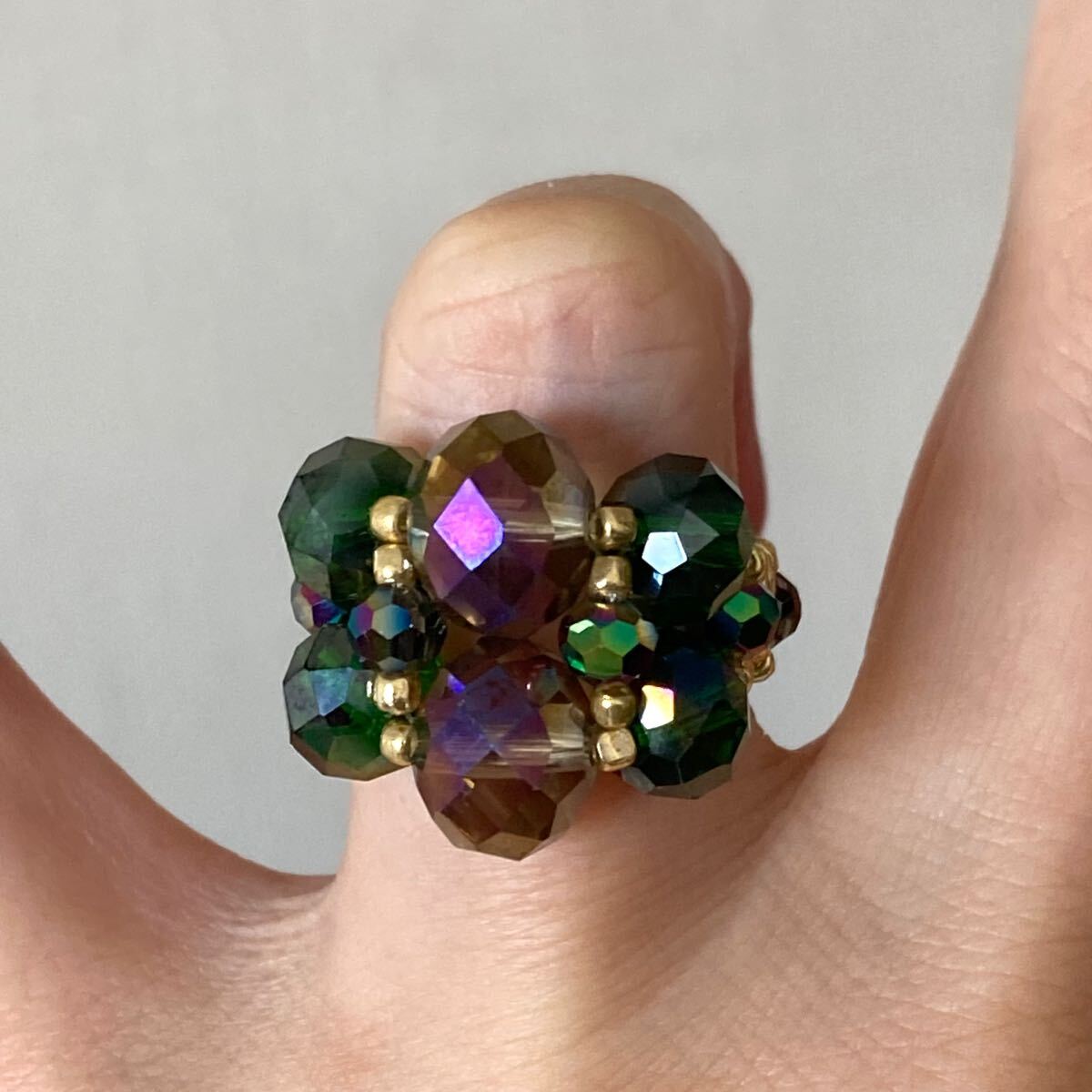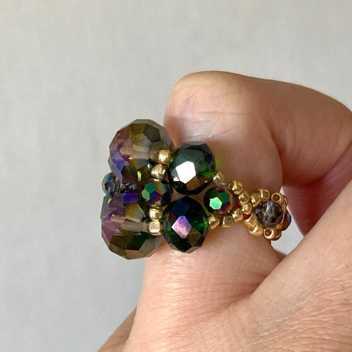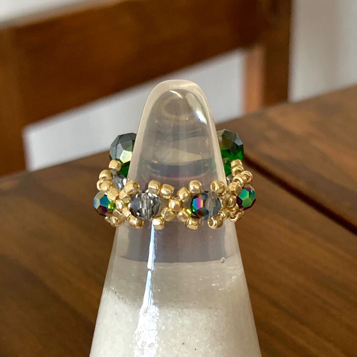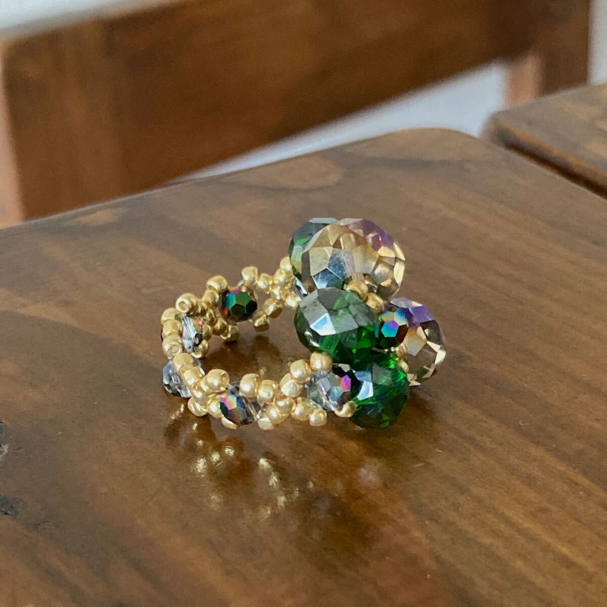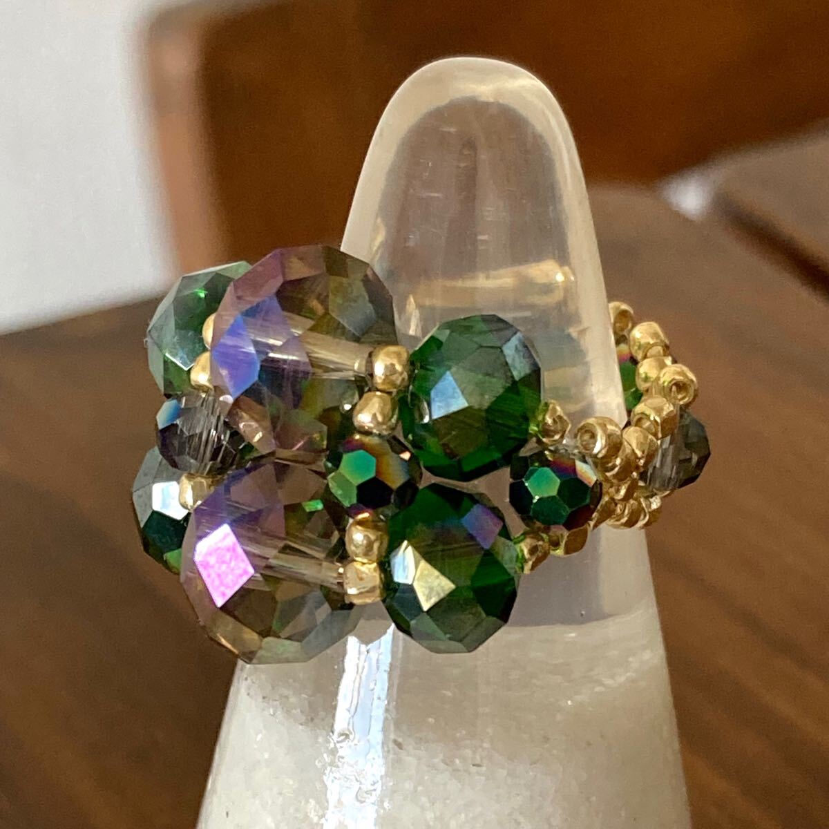 10mmのグレージュ、8mmのグリーンのボタンカットビーズ、4mmのクリアにグリーンオーロラ系のカットガラスビーズ、ゴールドのスリーカットビーズで作ったリングです。