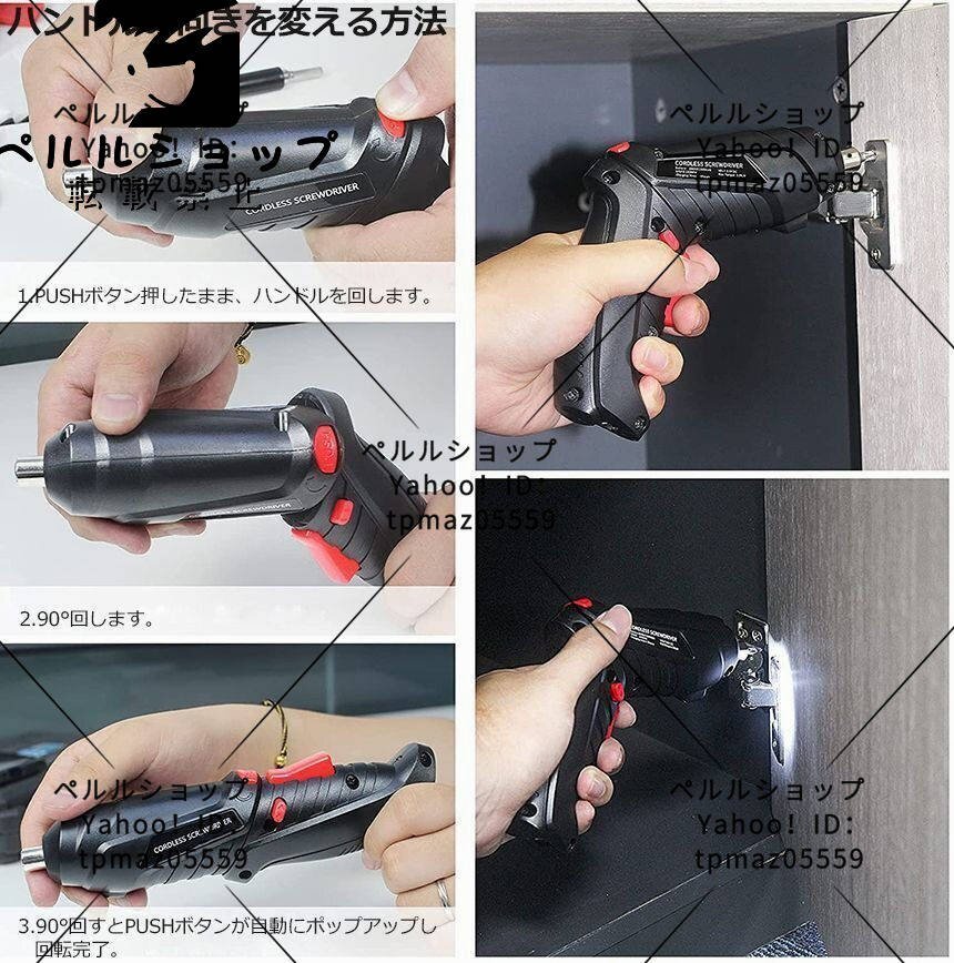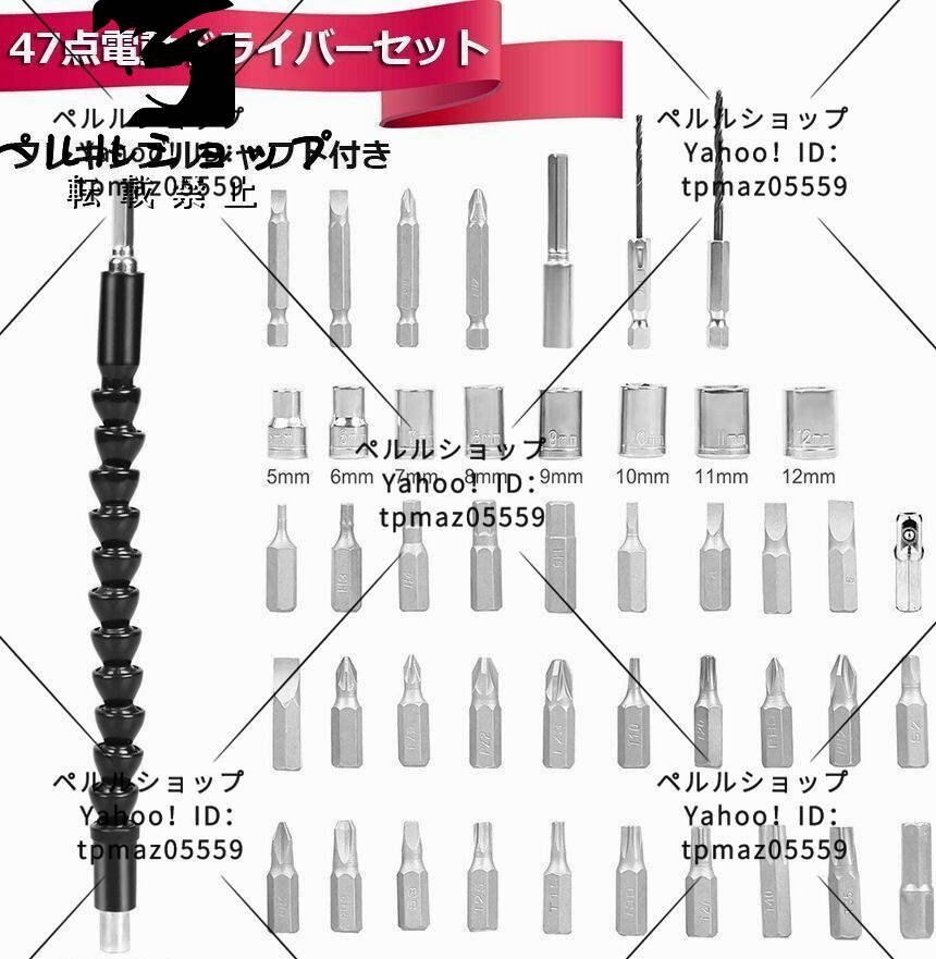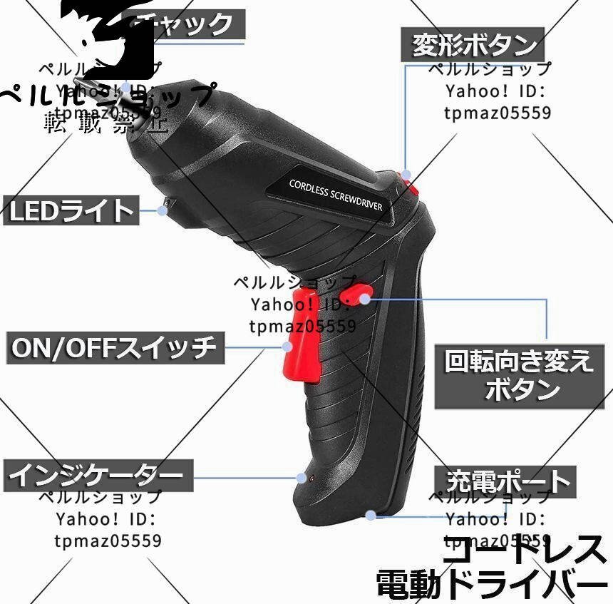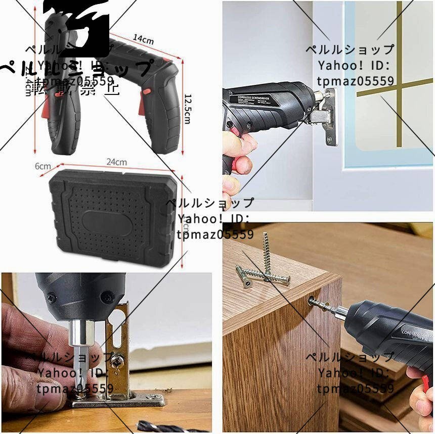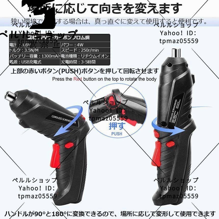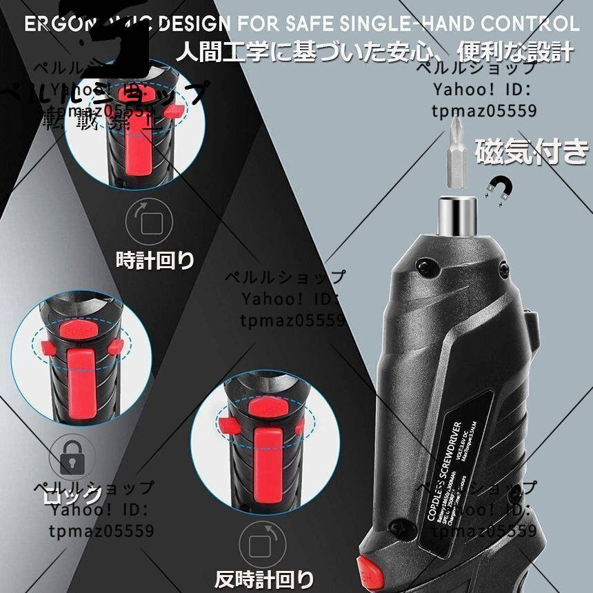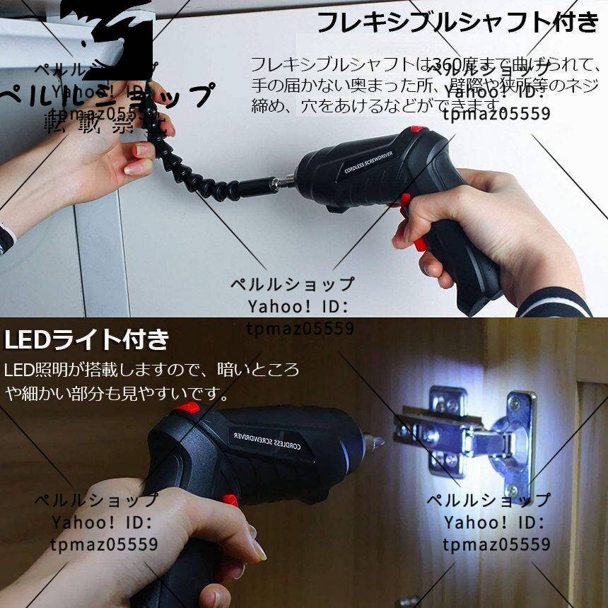 【47点セット】25mm CRVビット20本(プラスビット--PH0/PH1/PH2/PH3/PH4;マイナスビット--SL2/SL3/SL4/SL5/SL6;ヘックス--H2/H3/H4/H5/H6;トルクス--T10/T15/T20/T25/T30)、50mm CRV プラスビット2本(SL4/PH2)、HSSツイストドリル2本(2.0/3.0)、六角ソケット5個(7mm/8mm/9mm/10mm/11mm)、全部32個ビットが付属して、USB電源ケーブル、50mm ソケットコンロッド、50mmビット延長アダブター 【正逆回転切替え可能】正逆転レバーの位置を調整することで、ビットの回転方向を切り替えでき、ネジを締め付けるだけでなく、ネジを緩めることも可能です。正逆転レバーを押すだけで、切り替えでき、操作も簡単です。 【LEDライト付き】LED照明が搭載しますので、暗いところや細かい部分も見やすいです。振動ドリルが作業すると同時に、ライトも点灯して、そのままでスムーズで楽々作業できます。 【USB充電式】1300mAhリチウムイオン電池、満電する場合に、連続使用は0.5時間程度できます。USB充電式だからさっと出せて使える。便利なコードレスタイプで、作業場所を選びません。 【小型軽量&多用途】小型でコンパクトの電動ドライバーは、グリップにはラバー加工で、滑り止め、しっかり握ることができ、様々な場合に利用できます。疲労感を緩めて、片手で操作することができます。 家具、電気機器などの組立をするだけでなく、木材・アルミ金属などの加工も適用します。(※注意:厚く硬い金属や壁など場所に利用しないでください。)