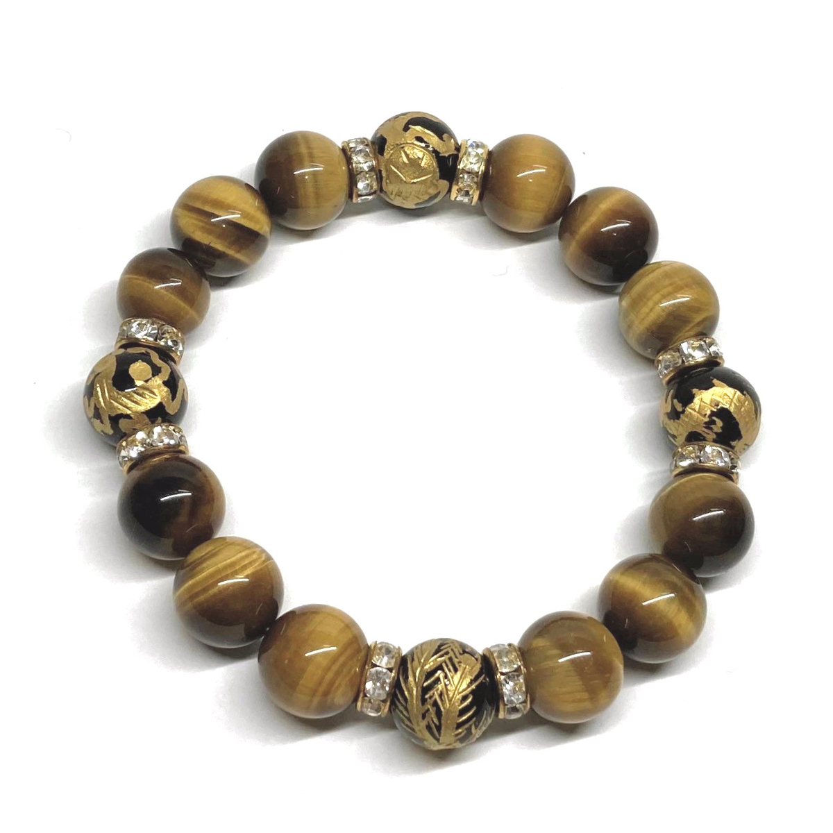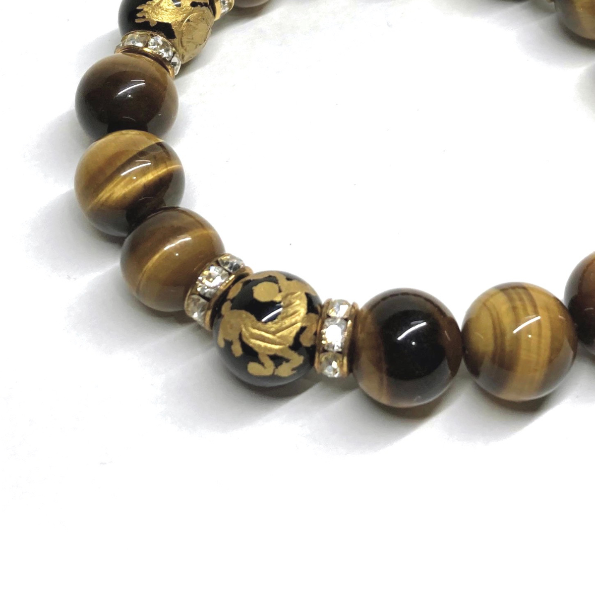 こちらは、四神獣金彫オニキとタイガーアイを組み合わせたパワーストーンブレスレットです。四神獣は、中国の伝説で4つの方向(東西南北)を守護する神聖な神。四神獣、厄災から身を守り、多くの運気を呼び込むと言われております。石大きさは程よくインパクトのある12mm玉で内周 約17cmです。 数に限りがございますので気になる方はお早めにどうぞ。