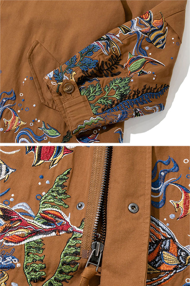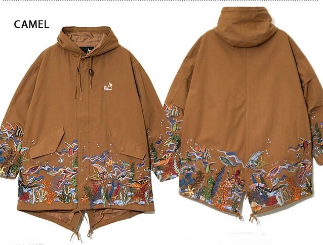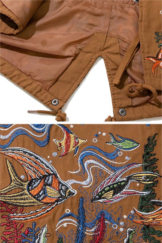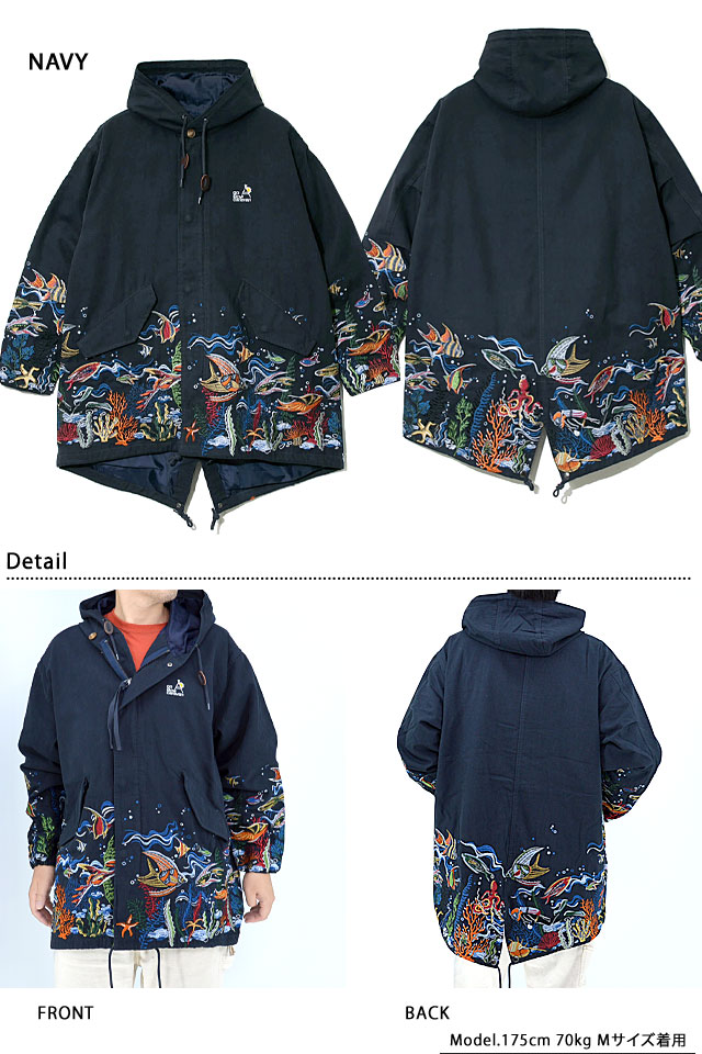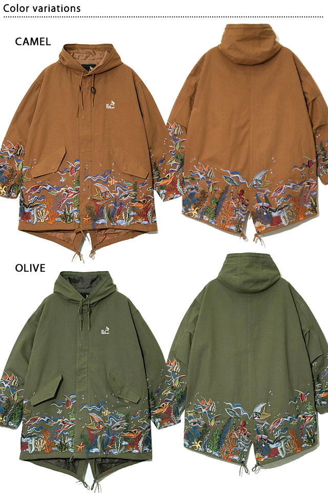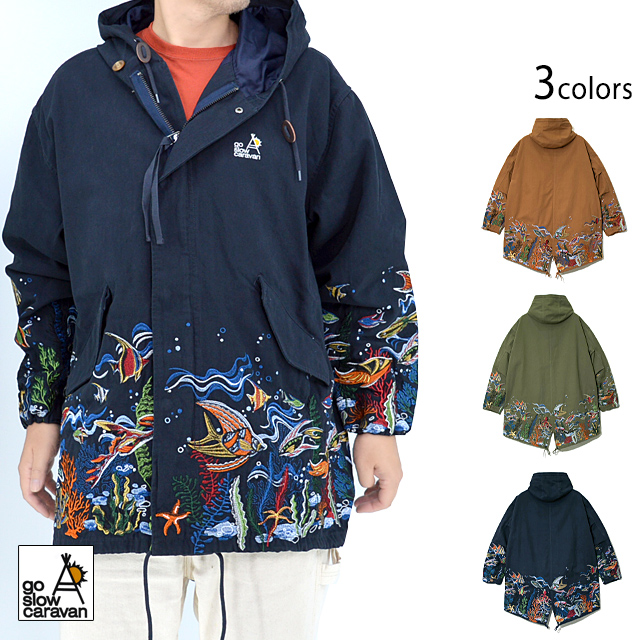 旅行やフェス、キャンプ、サーフィン、サイクリングなど、外遊び好きの仲間が集まってはじめたブランド【go slow caravan】より「ライトキャンバスパネル刺繍モッズコート(330219)」のご紹介です。 大人気のパネル刺繍モッズコートがついに今季、大海原へ! 裾から腰にかけて海底をイメージした刺繍を贅沢に施した大人気のモッズコートです。 使用している生地は、ライトな仕上がりながら張りがある綿100%の絶妙な雰囲気あるものをチョイスしました。 サイズ感も流行のBIGシルエットを採用しているので、ジェンダーレスに着ていただきたい1着です。 | ||||||||||||||||||||