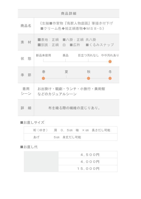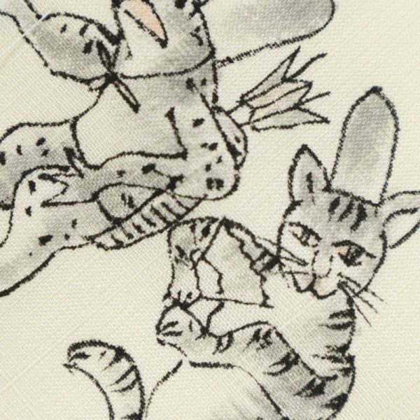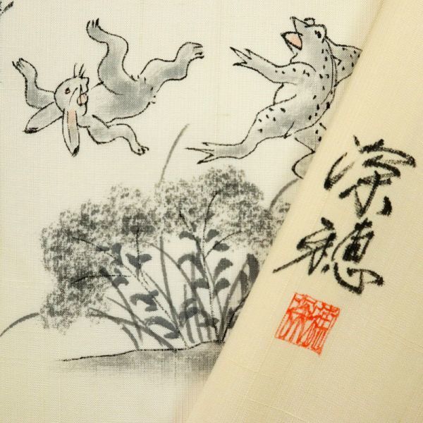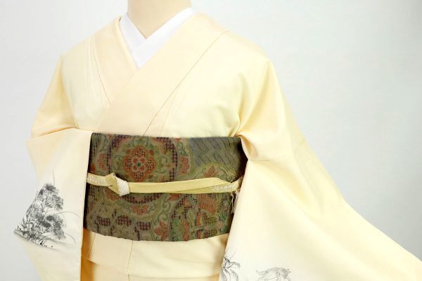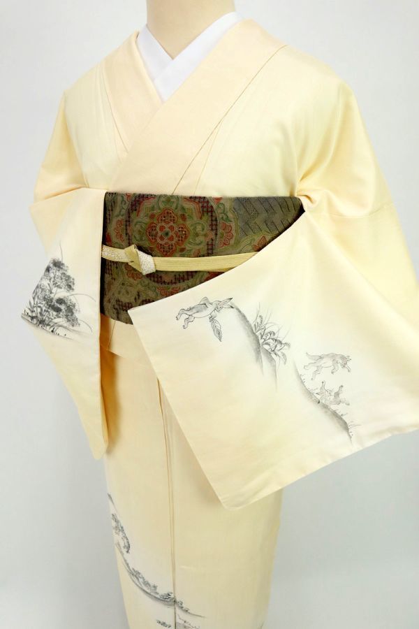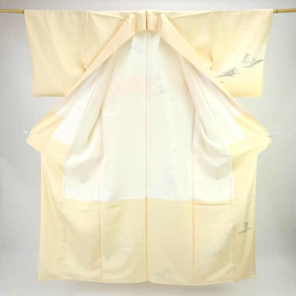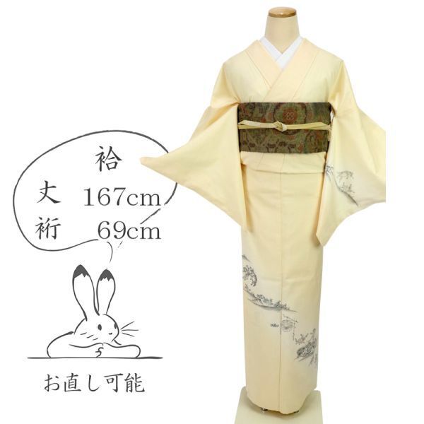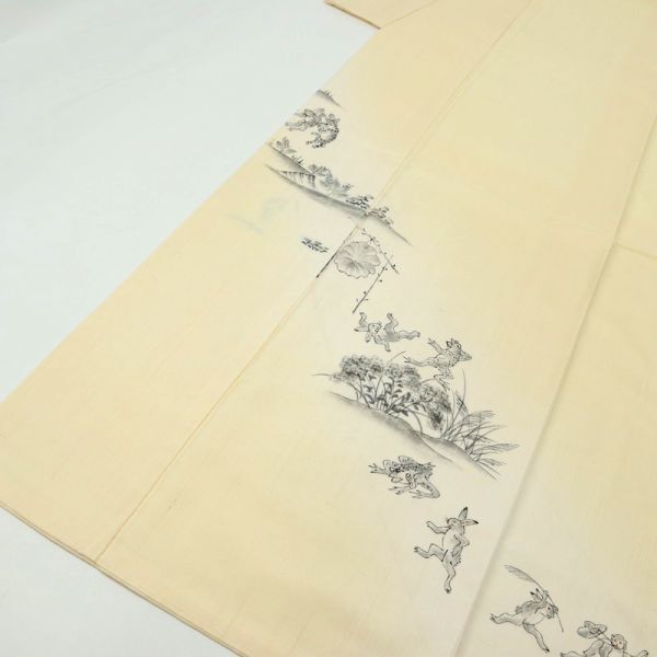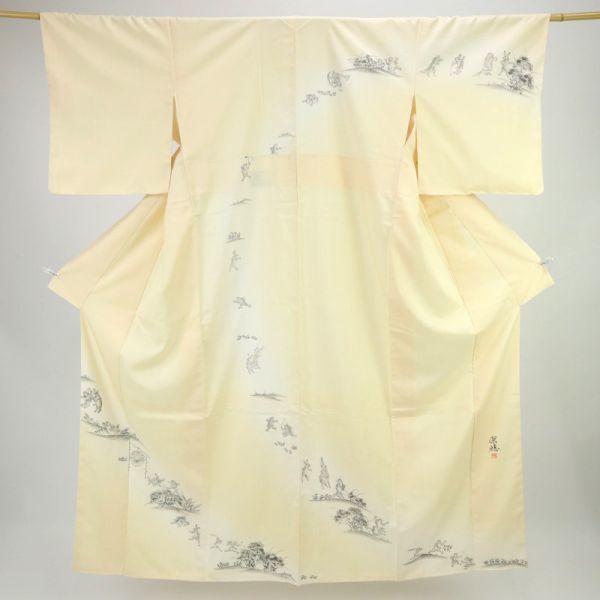 【付下げ】 生紬 作家物 『鳥獣人物戯画』 筆描き 付下げ クリーム色 袷 正絹 着物 MS8-5