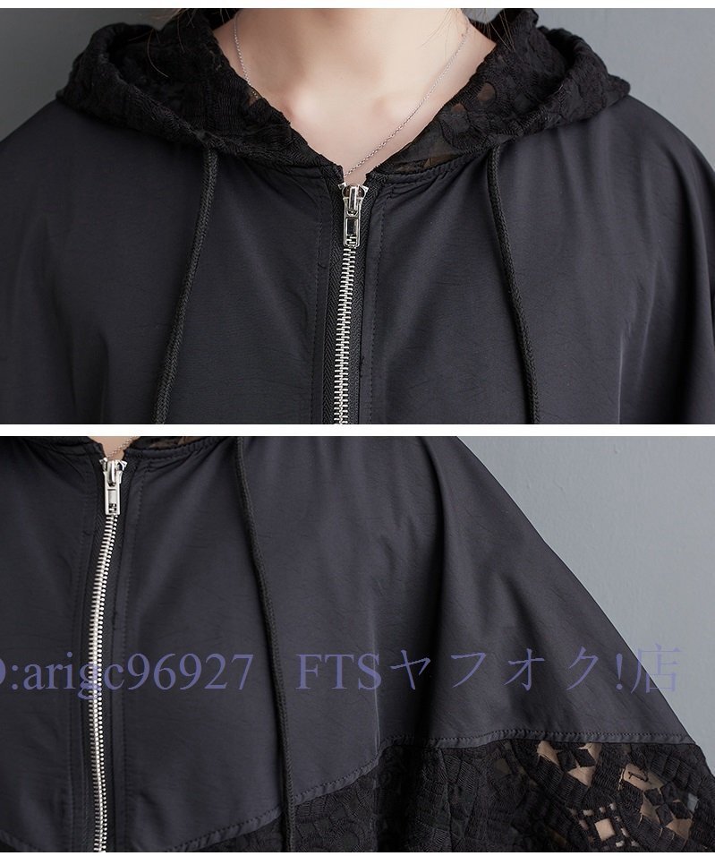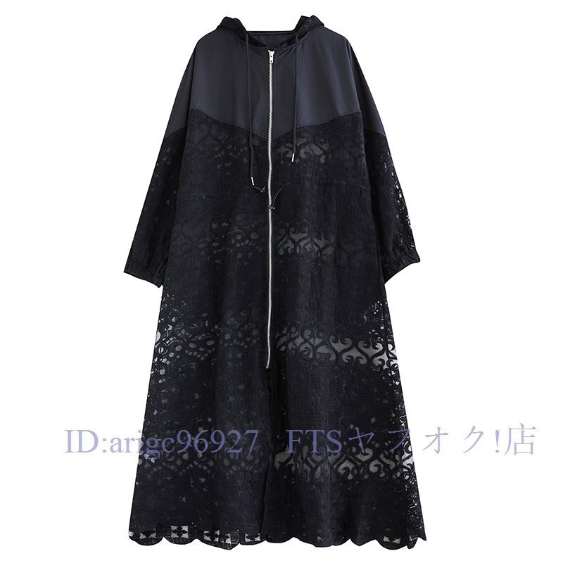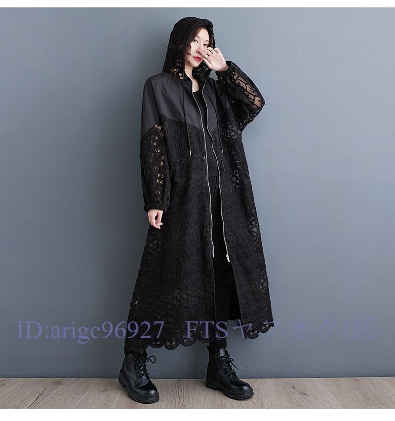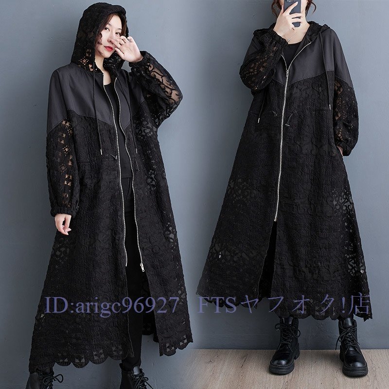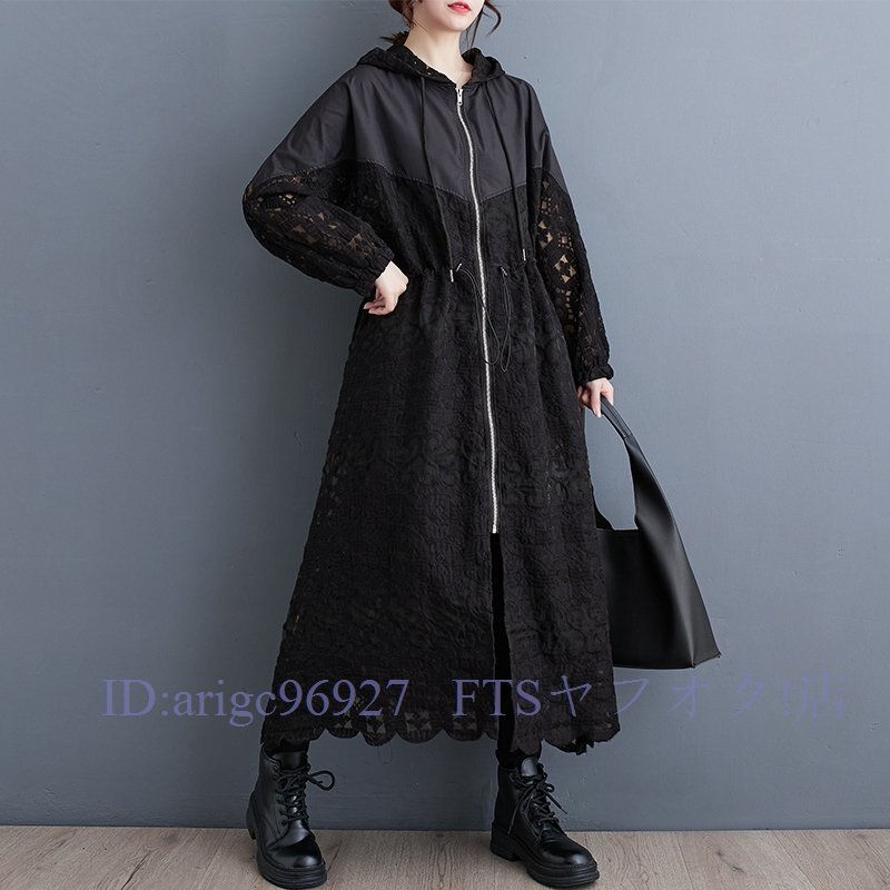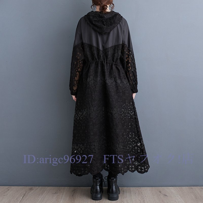 A6291☆新品秋 レディース カジュアル ゆったり大きいサイズ 体型カバー 切り替 レース フードつき コート F 黒