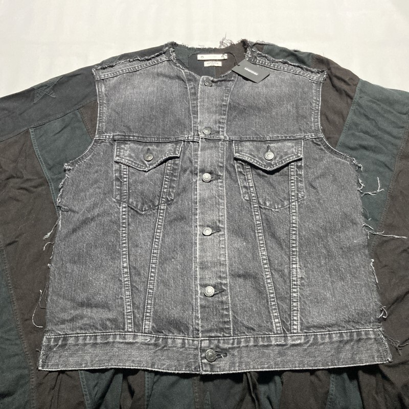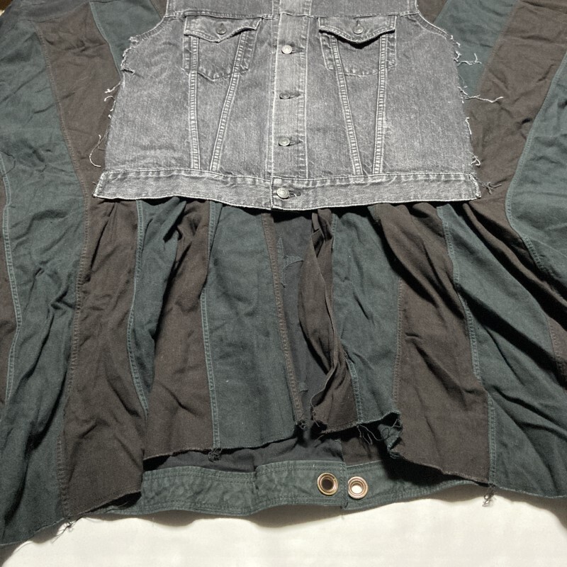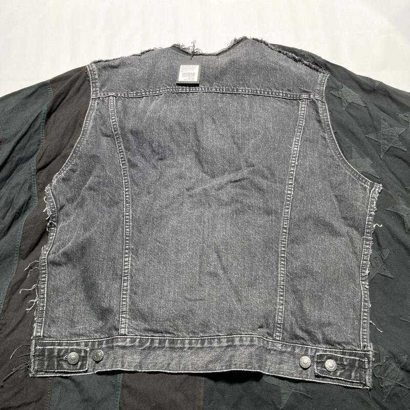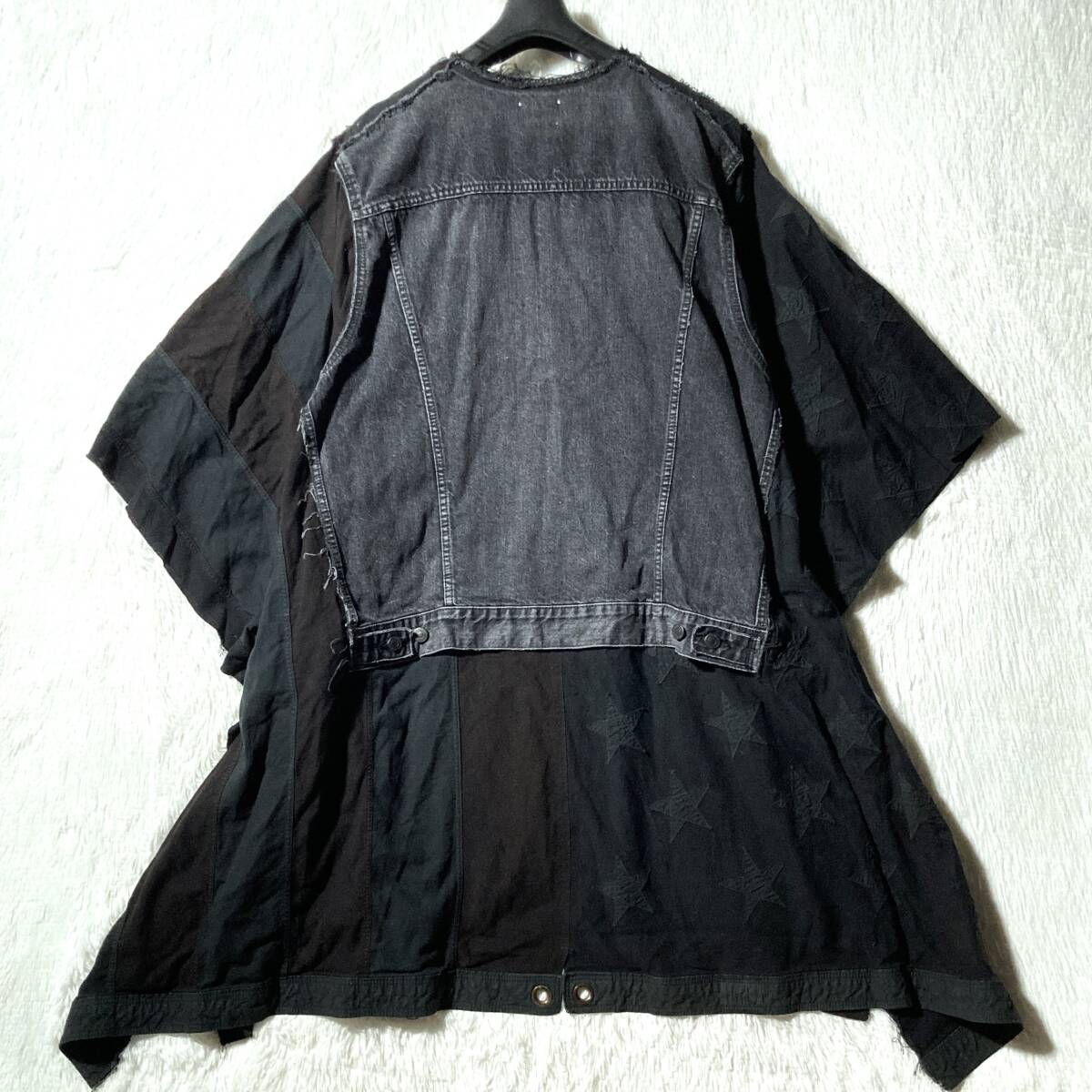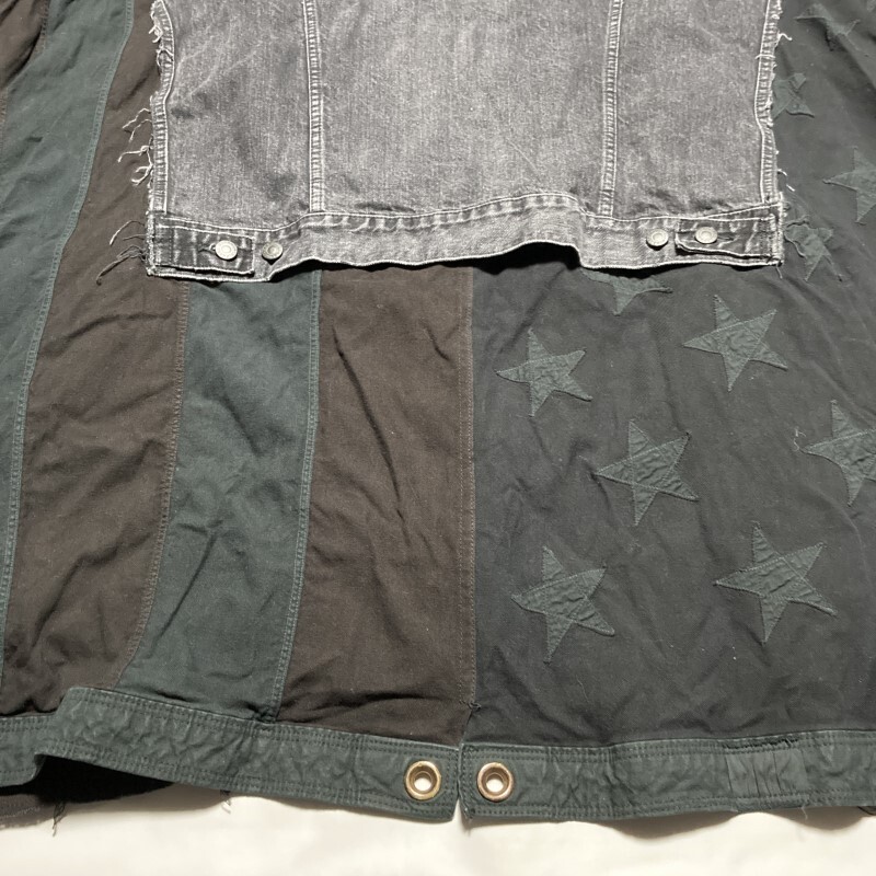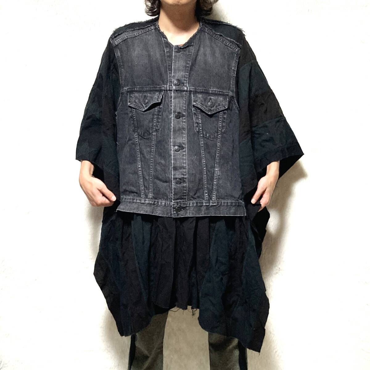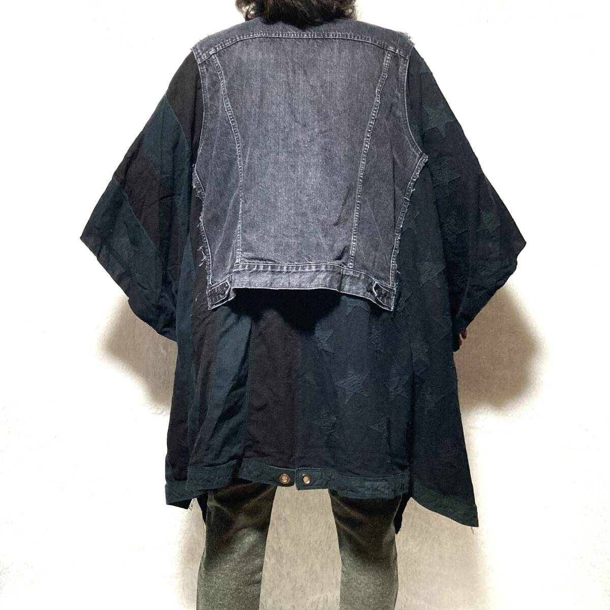 ・ヴィンテージの星条旗を黒く染め上げ、MINEDENIM製のブラックデニムトラッカージャケットを解体、再構築して仕上げたポンチョジャケット。