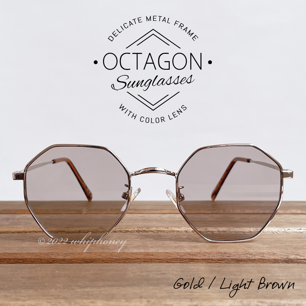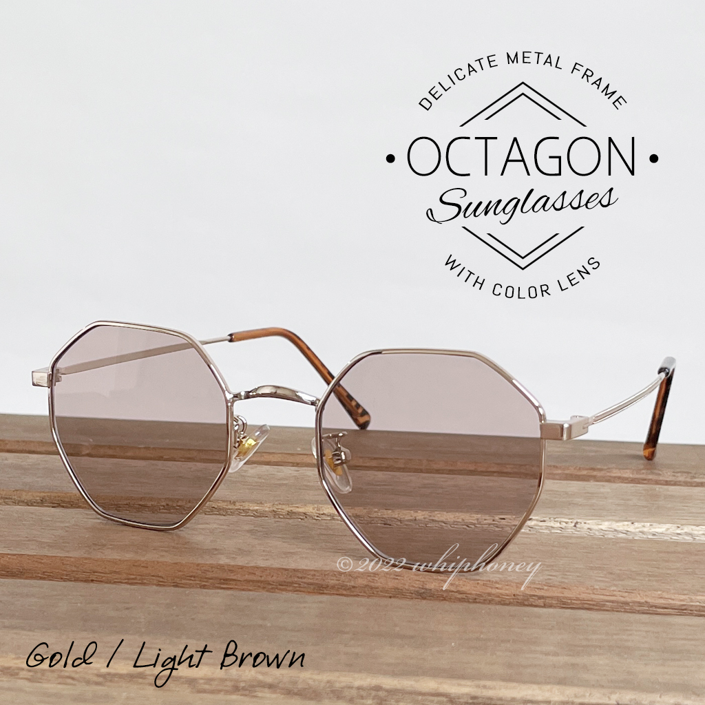 レトロな八角形シェイプ オクタゴンUVサングラス ゴールド ライトブラウン