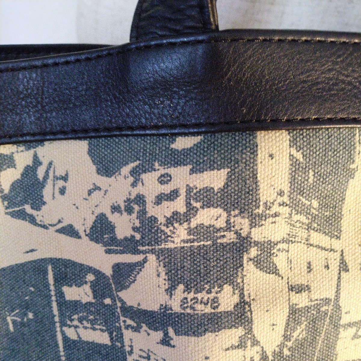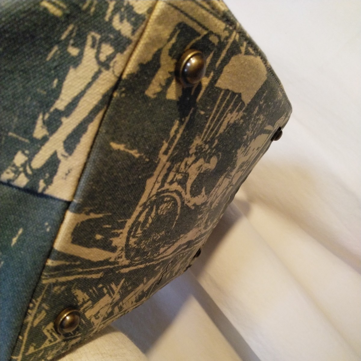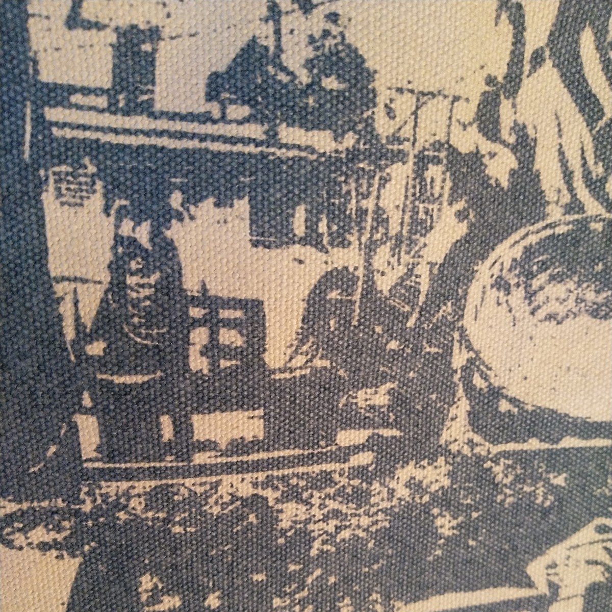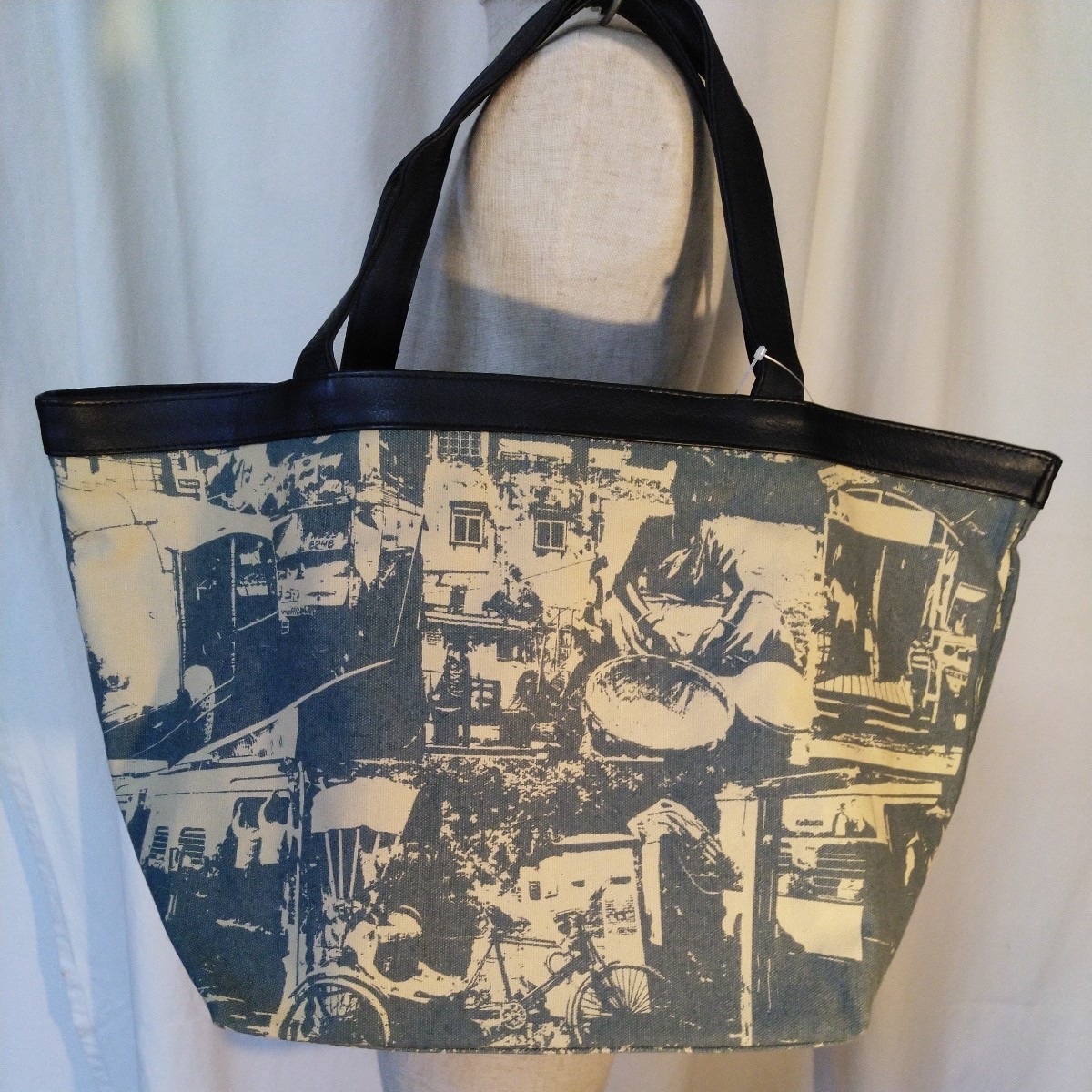 キャンバス 綿100% トートバッグ (大) コルカタcity柄 ベージュ×アッシュブルー 持ち手本牛革 ハンティングワールド の工場