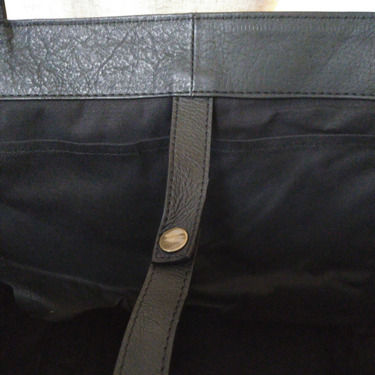 持ち手と、口部分の縁は 高級感のある本牛革 です。一枚革ではなく、表革を二枚合わせた高級仕様です。革の色はブラックです。