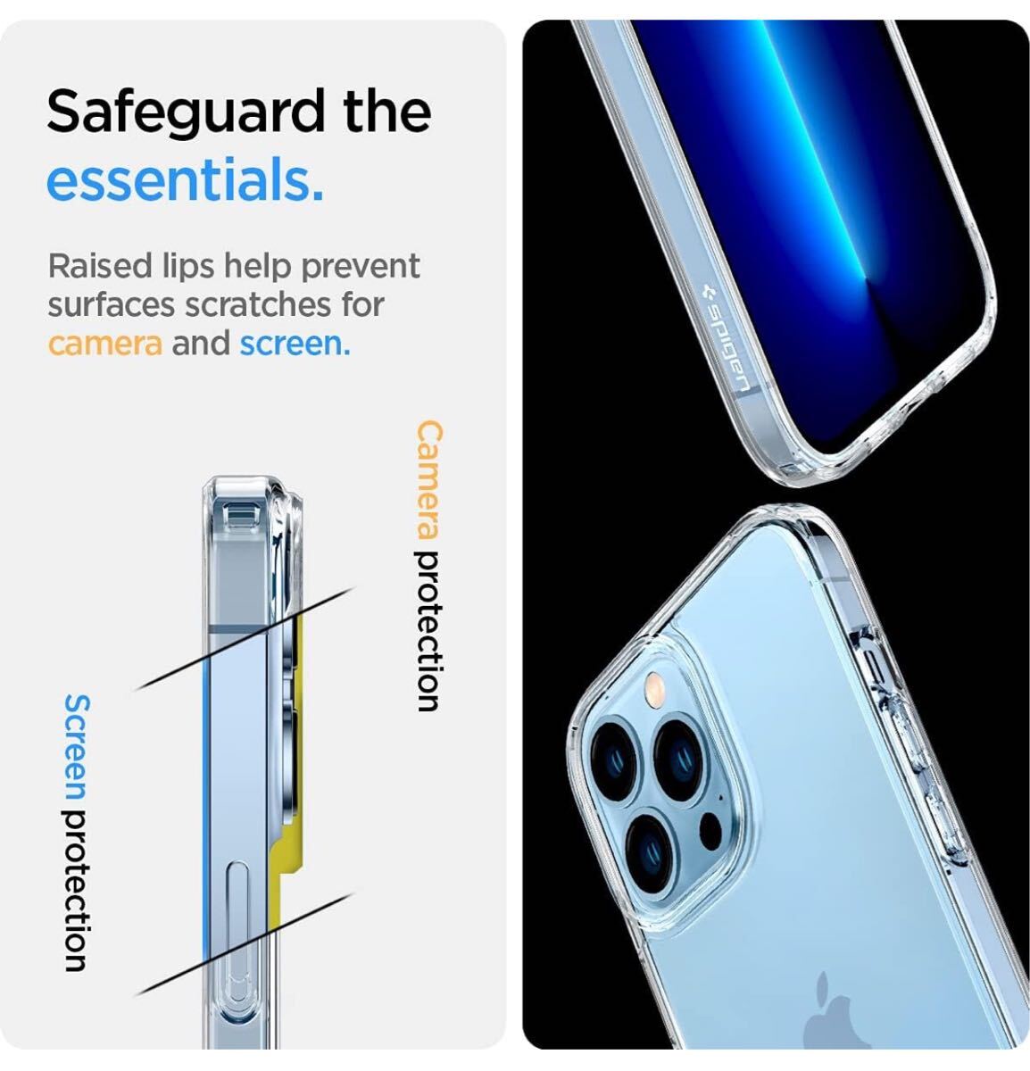 【カメラレンズも守れる薄さ】本体の薄さを維持しつつ、カメラレンズもしっかり保護出来る高さで設計されています。両面とカメラレンズにフチを設置し、予期せぬキズから守ります。