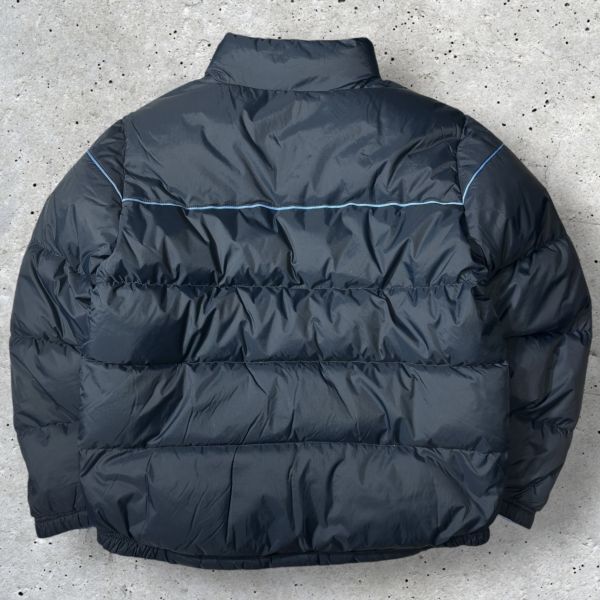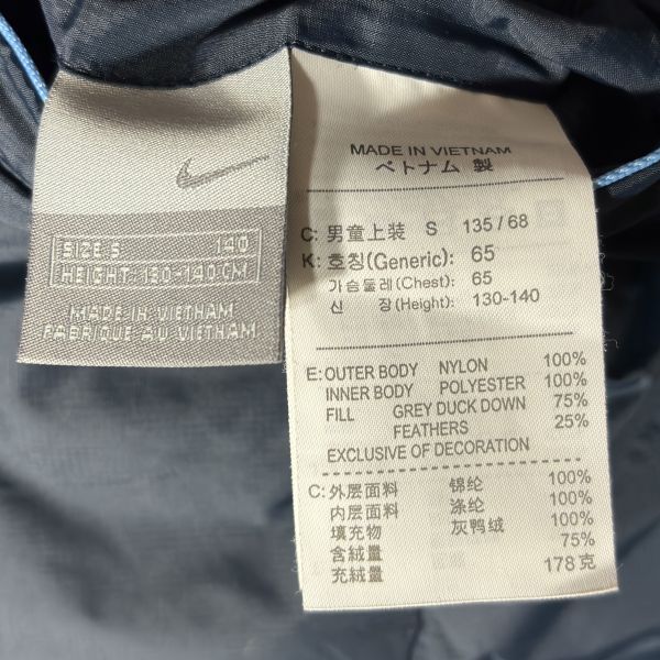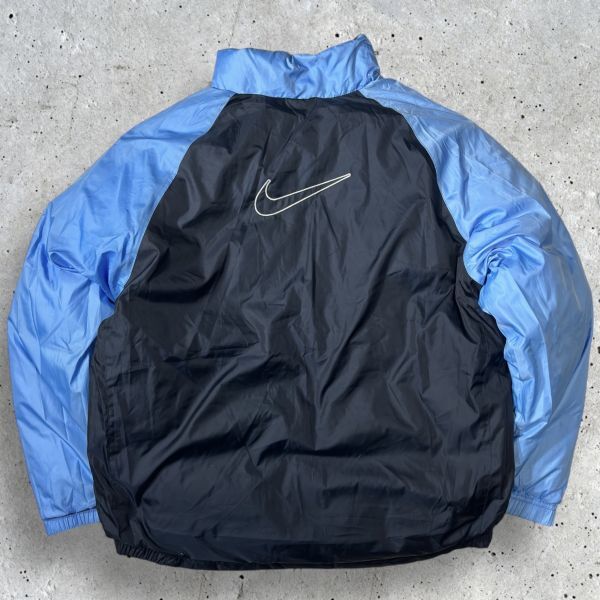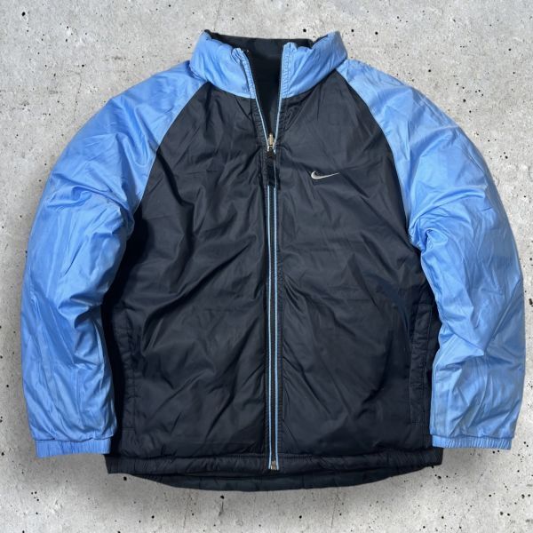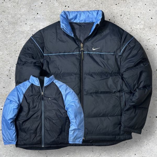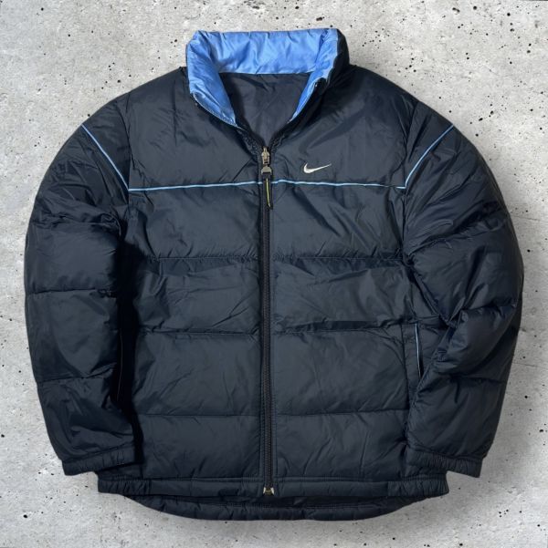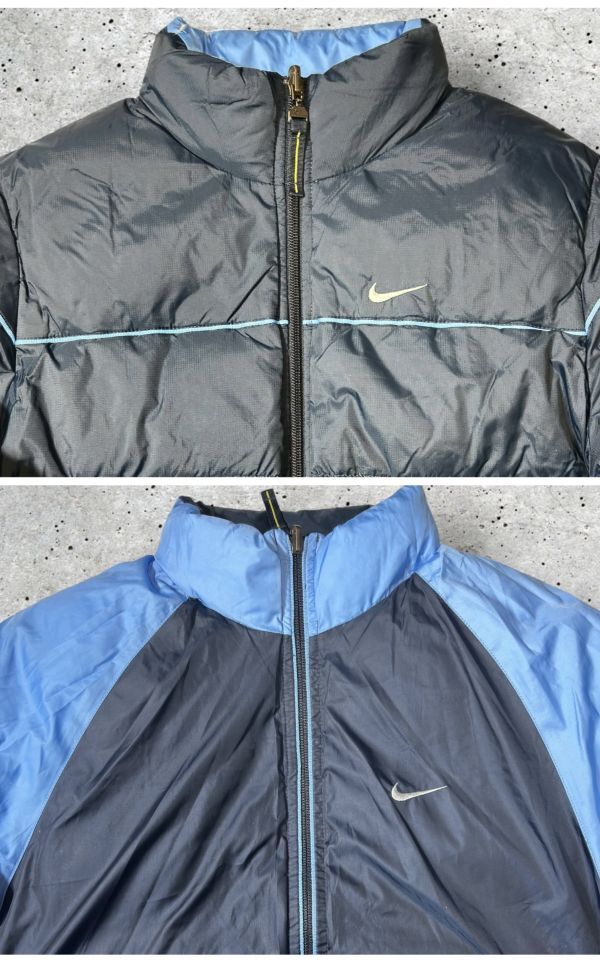 ★リバーシブルダウンジャケット★BIGプリント★NIKE sizeS ネイビー系 スウッシュ フルジップアップ アウター ナイキ レディース 古着 クリーニング プレス済み 1787