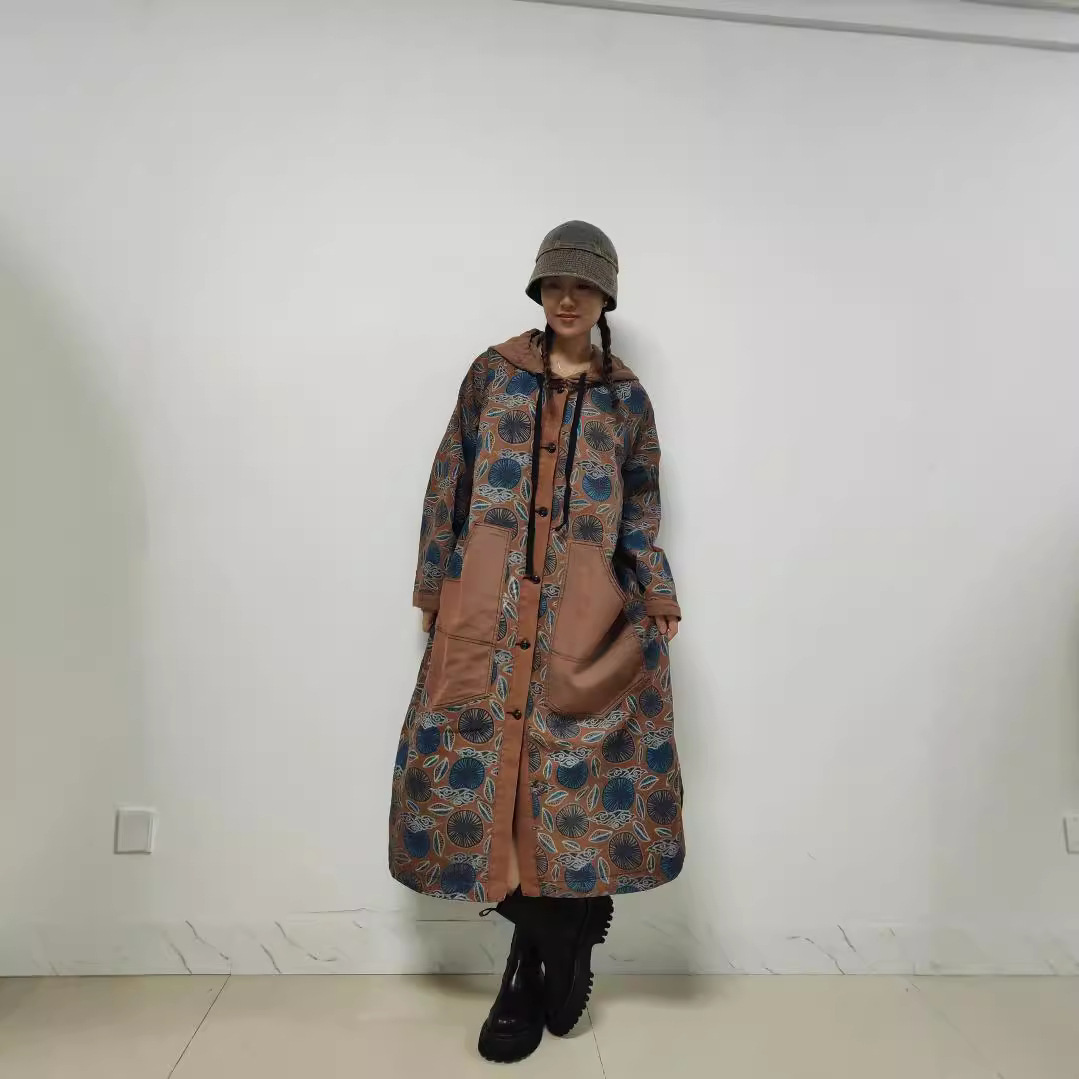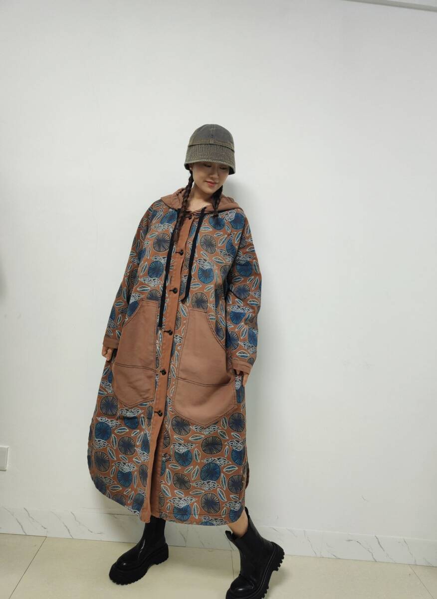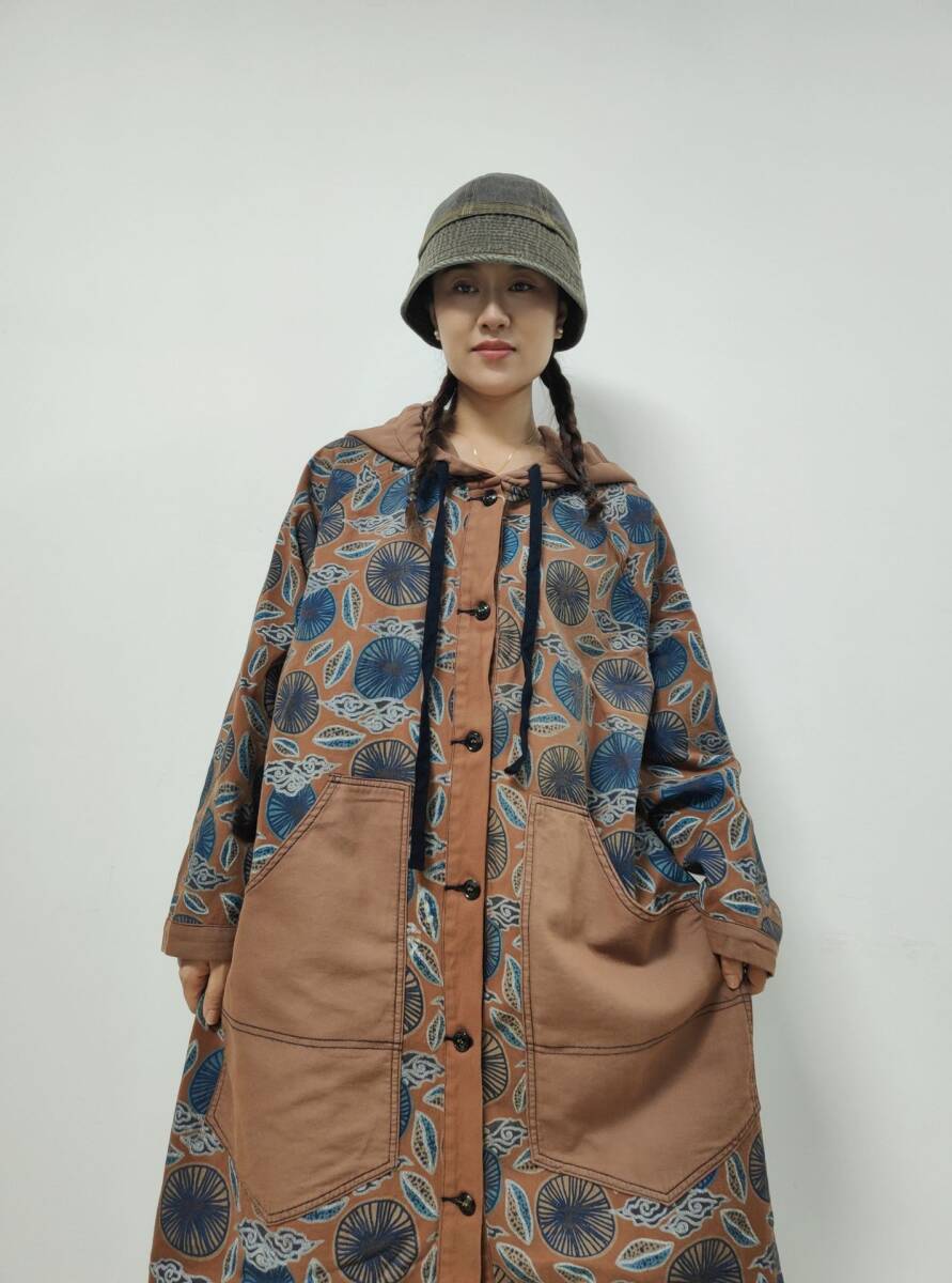 フードコート 大人可愛 プリント花柄 カーディガン ゆったり アンティーク風 長袖 デニム生地 ジーンズ