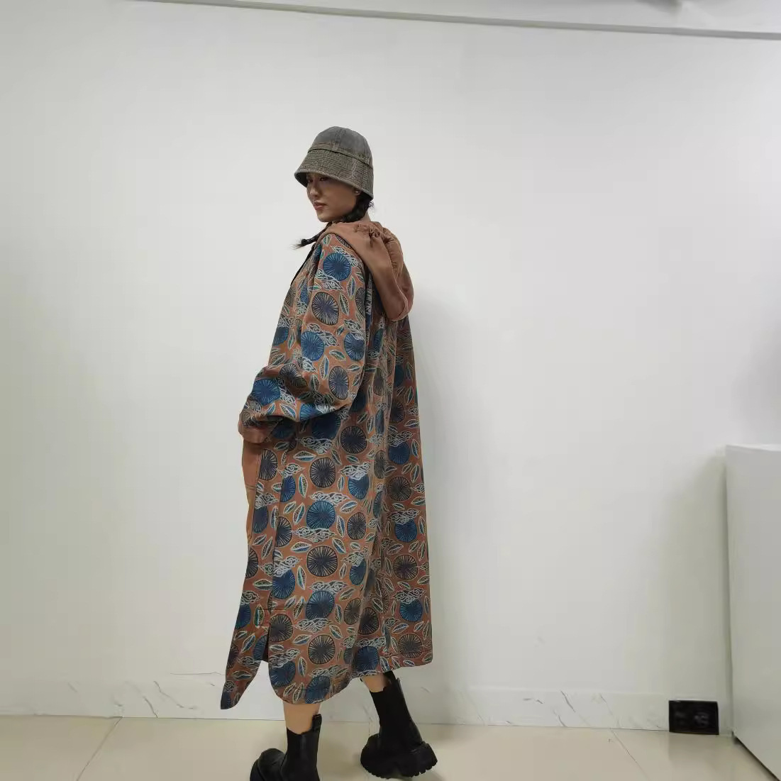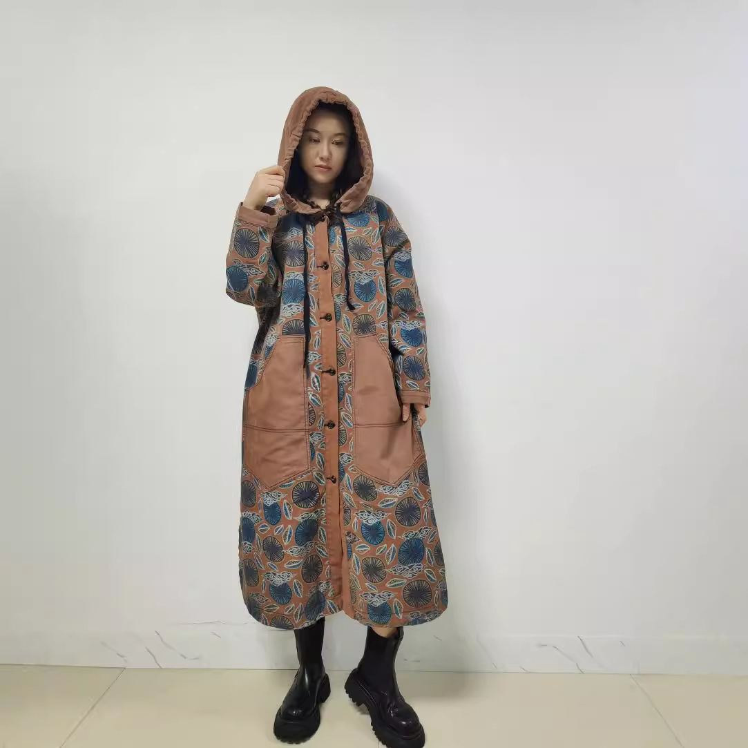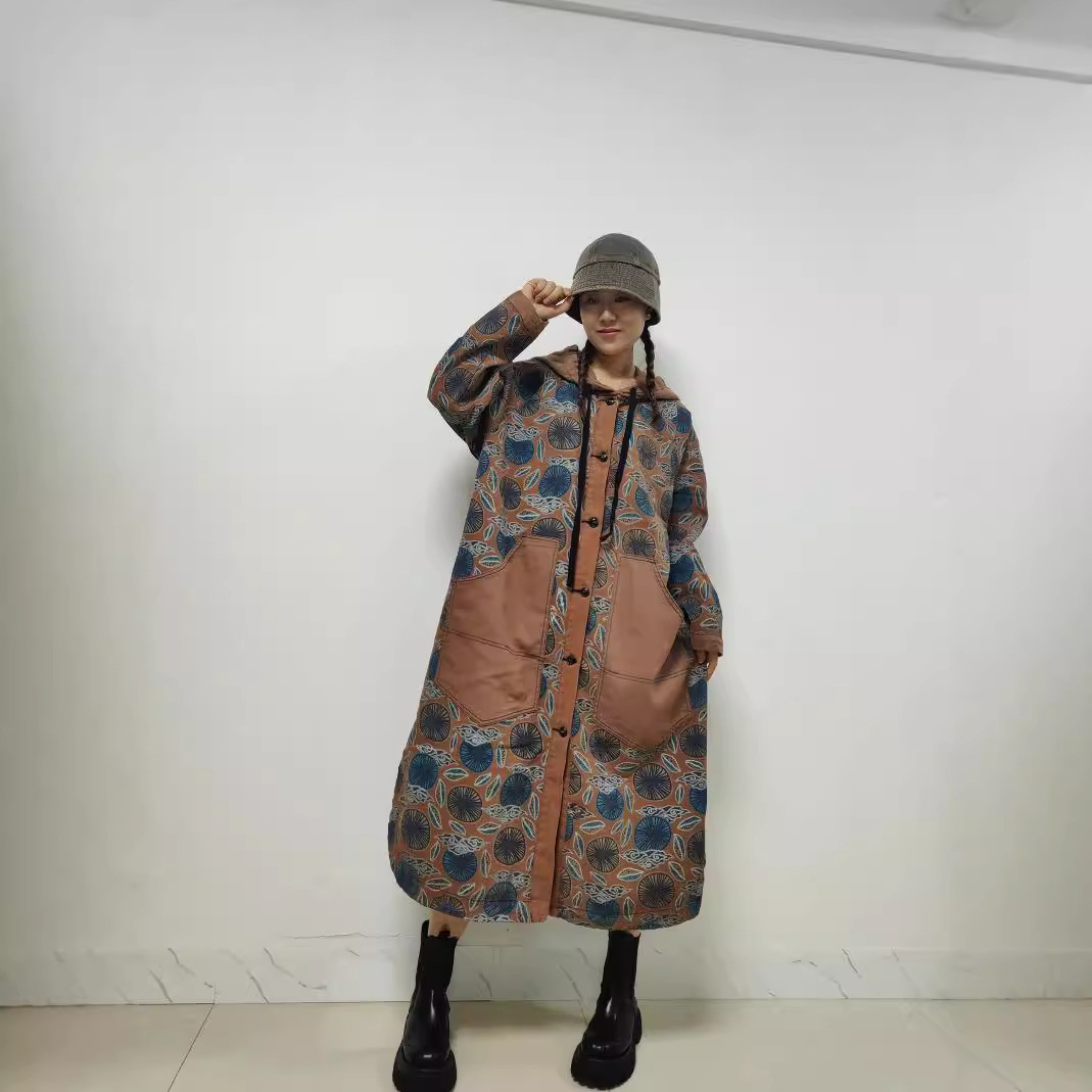 フードコート 大人可愛 プリント花柄 カーディガン ゆったり アンティーク風 長袖 デニム生地 ジーンズ