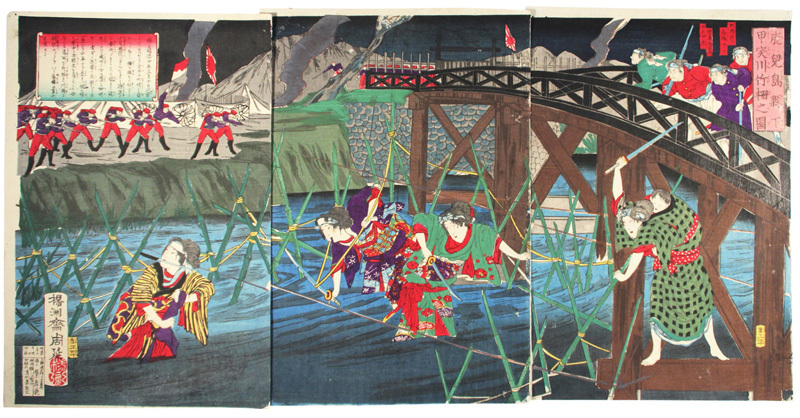 【書名】錦絵 鹿児島県下甲突川竹柵之図【著者】周延画【解説】三枚揃【刊行年】【数量】