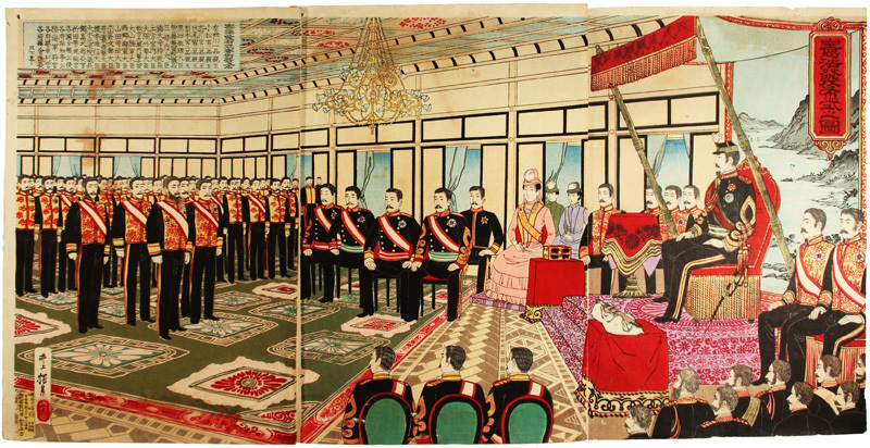 【書名】錦絵 憲法発布式之図【著者】探景画【解説】三枚揃 少シミ【刊行年】【数量】