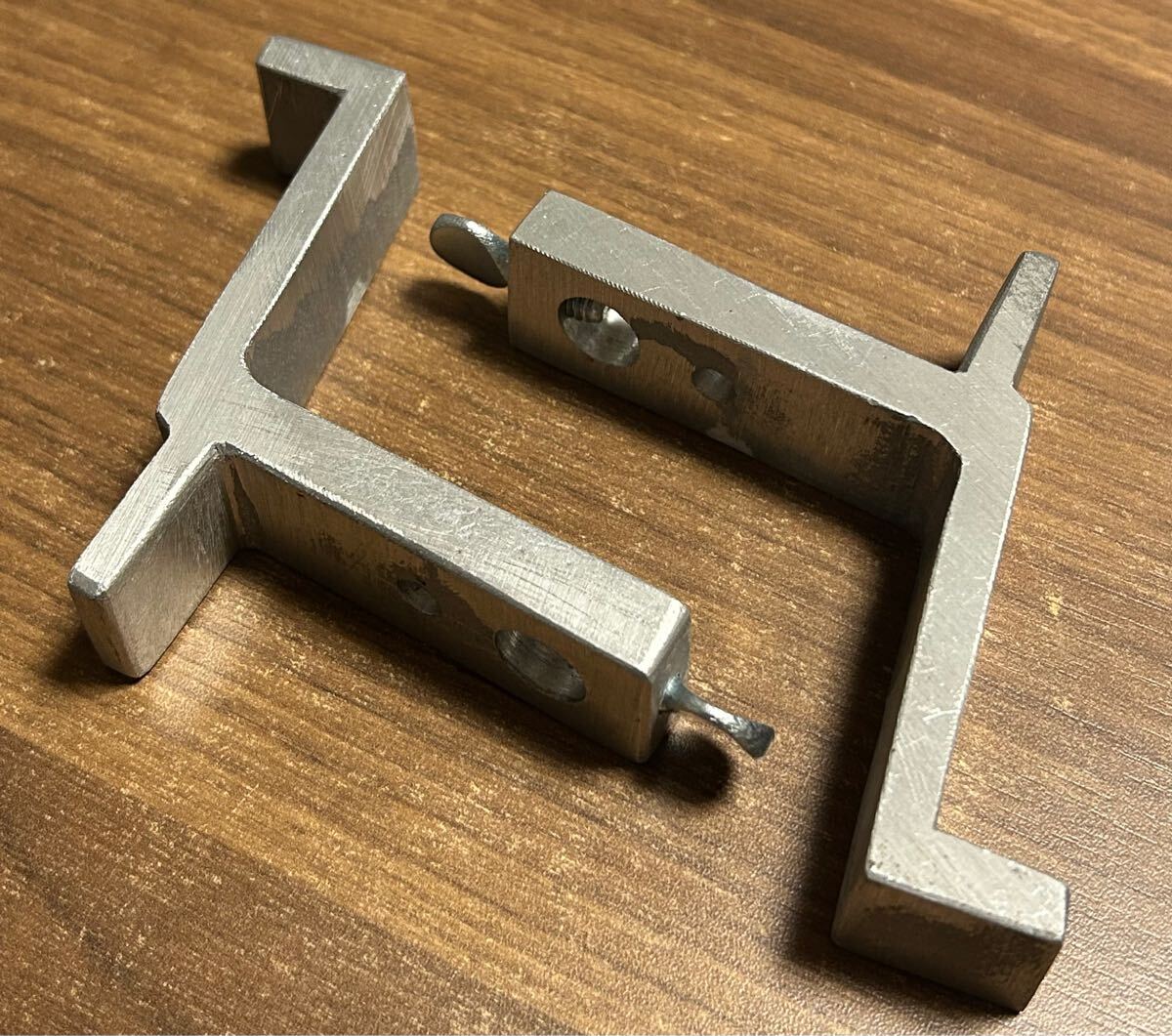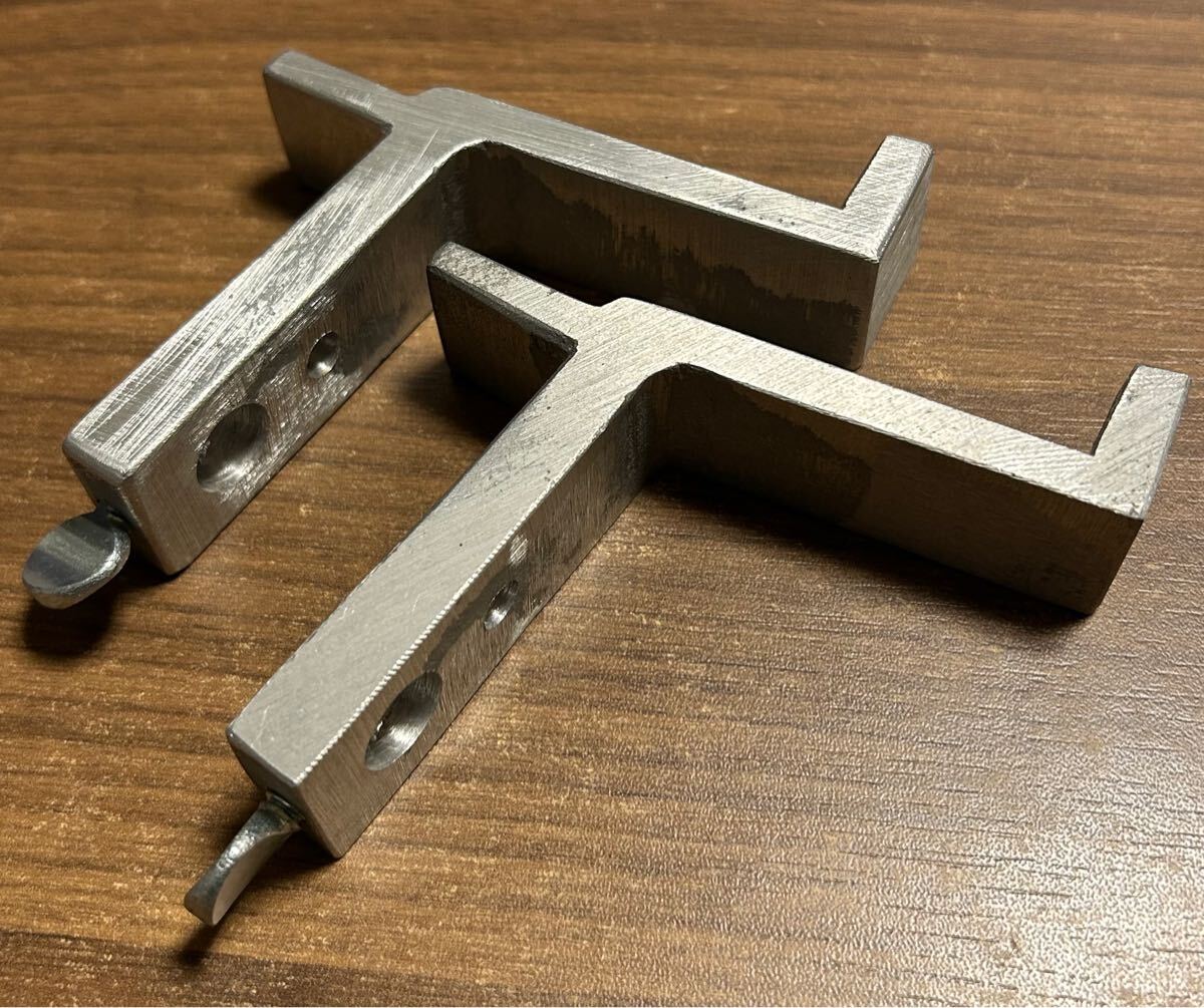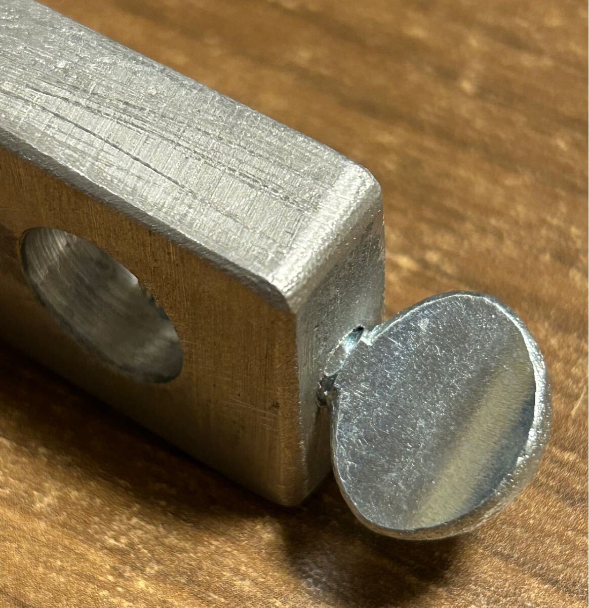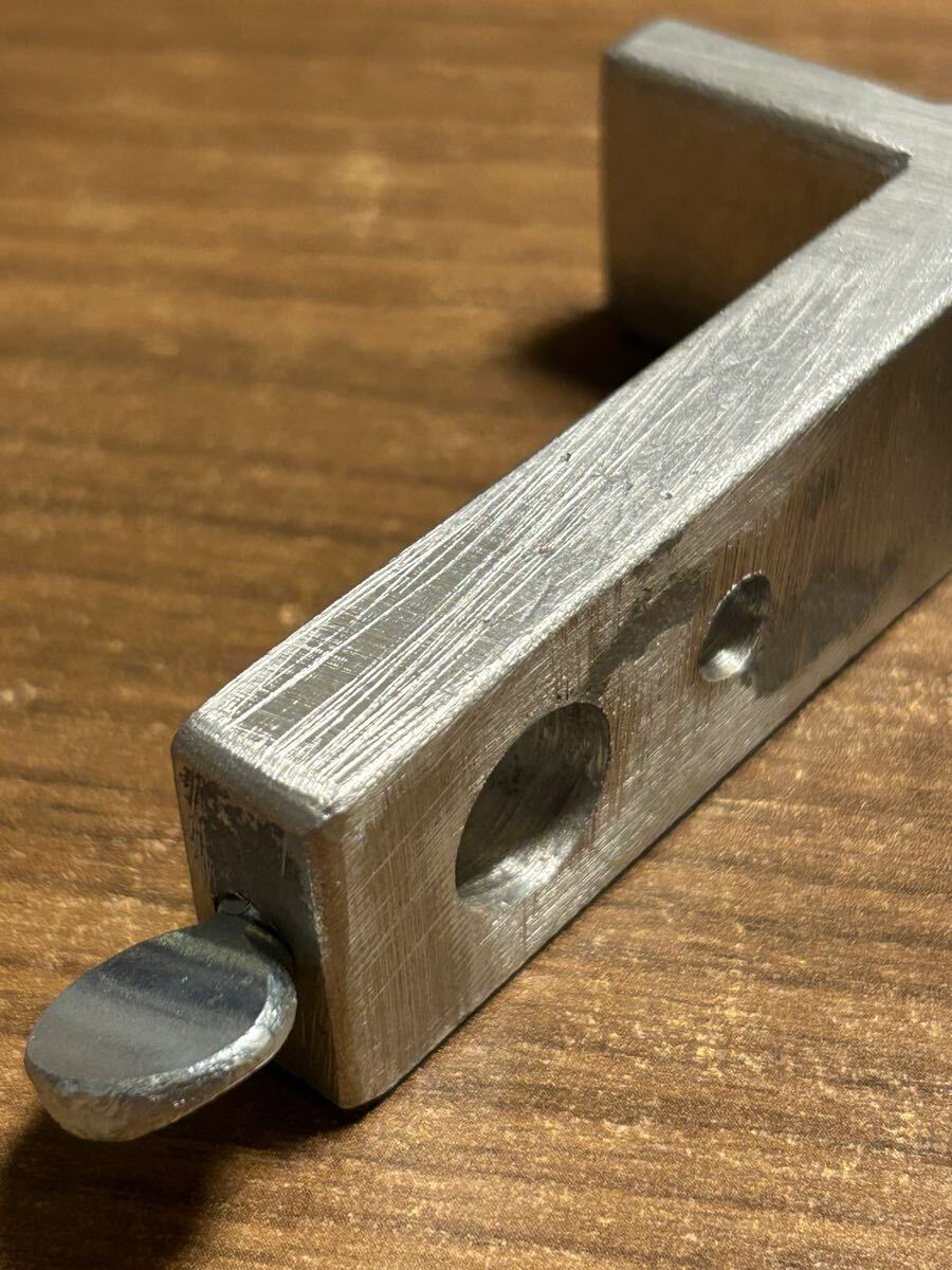 ご覧頂き誠に有難う御座います。釣具屋さんの売れ残りのアルミ治具の出品になります。当方では用途が分かりません。ネジ留めする大きい方の穴が内径13.1mm、小さい穴が内径6.75mmがノギス計測でした。片方には値札がついておりましたので未使用品で売物だったと思いますが、保管時の擦れや傷、汚れ等御座います。画像からご判断頂きお取引宜しくお願い致します。