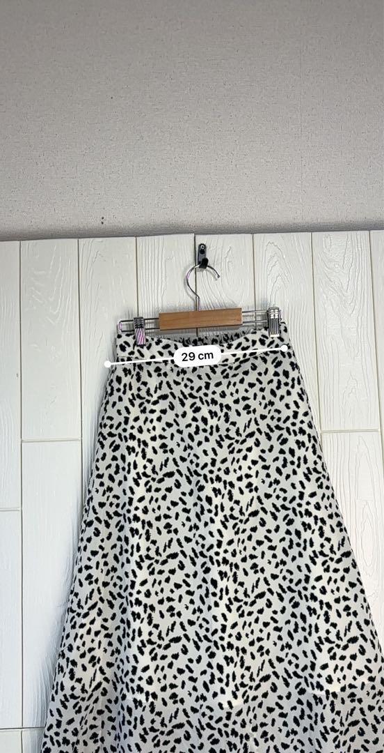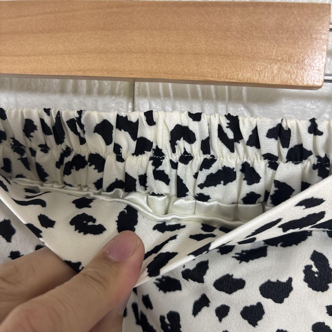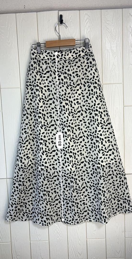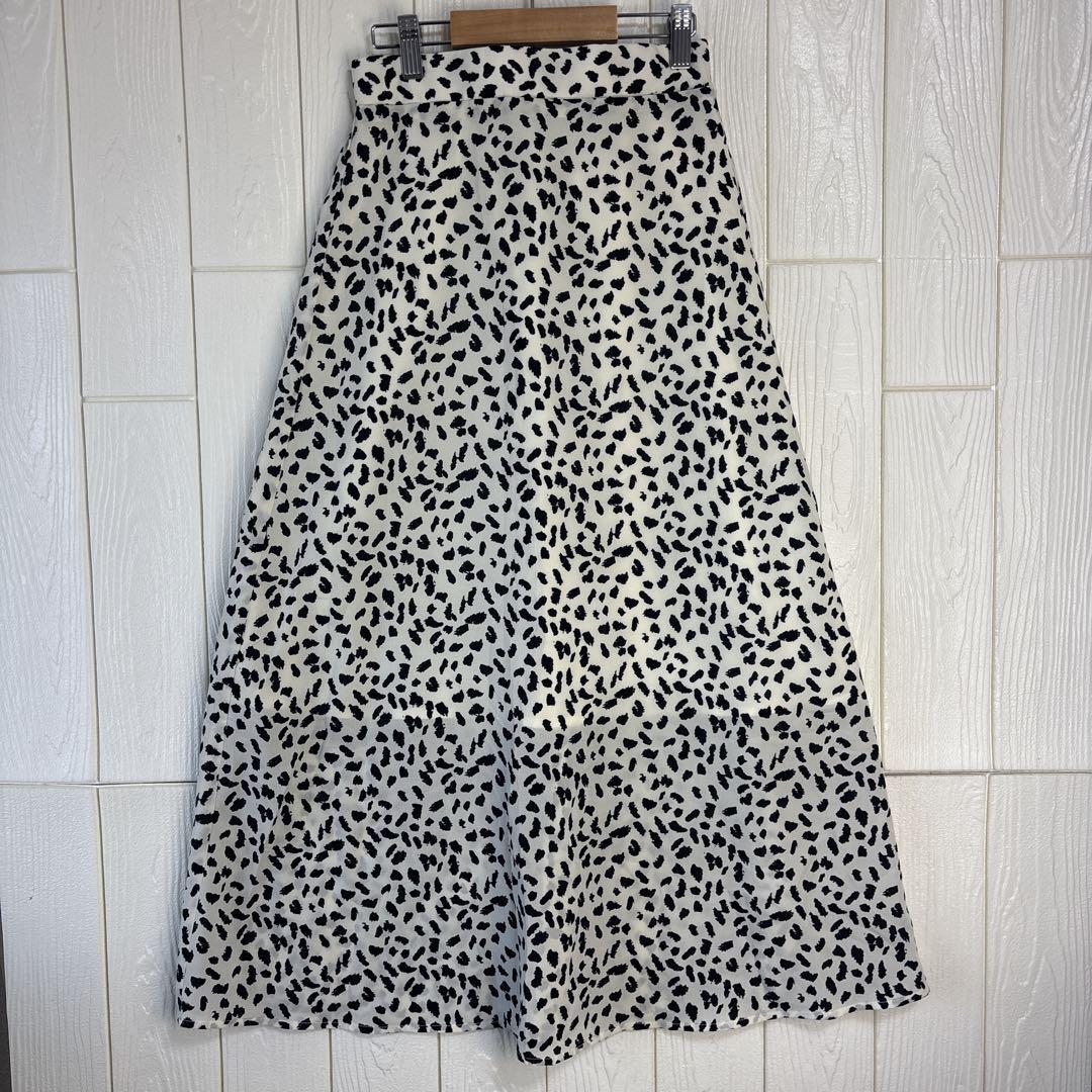 白地に黒の斑点模様が特徴的なフレアスカートです。シンプルながらも個性的な印象を与え、様々なコーディネートに合わせやすいデザインです。