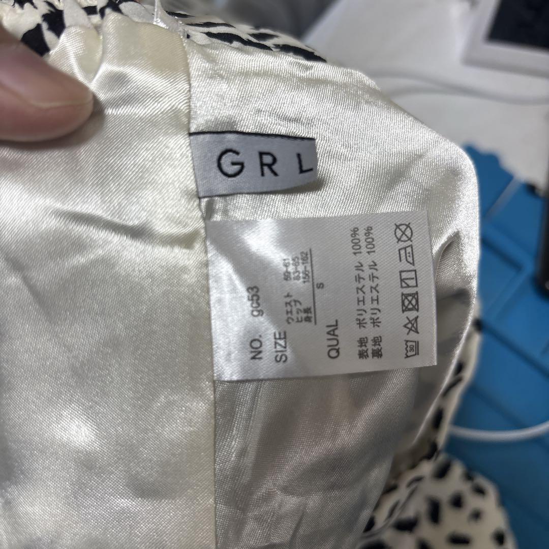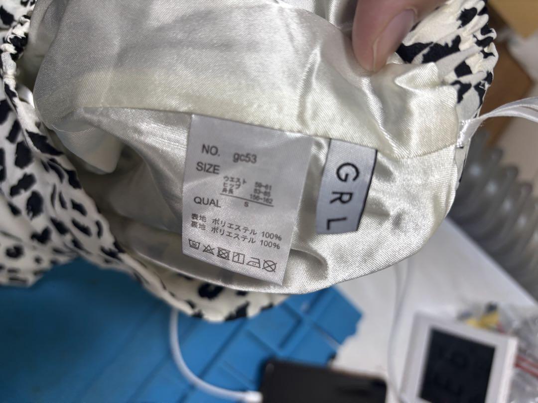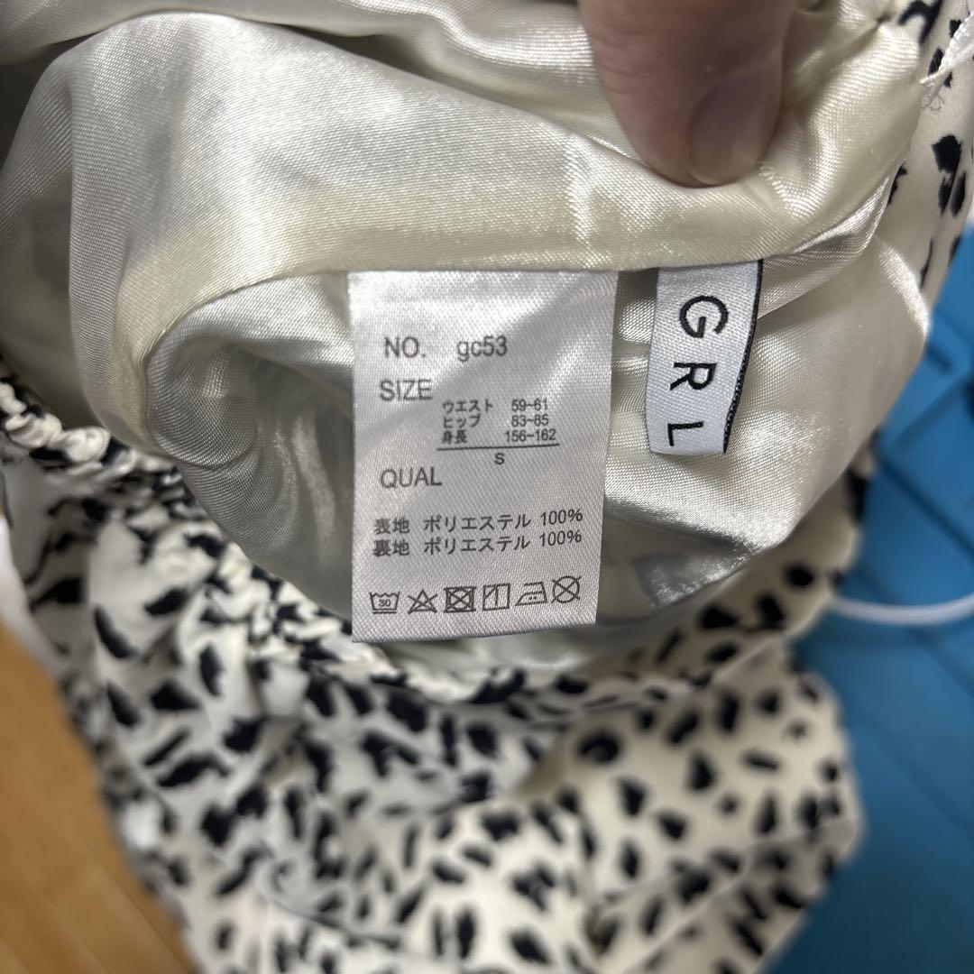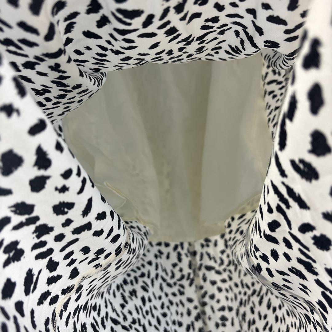 白地に黒の斑点模様が特徴的なフレアスカートです。シンプルながらも個性的な印象を与え、様々なコーディネートに合わせやすいデザインです。