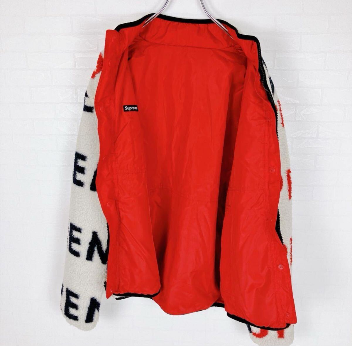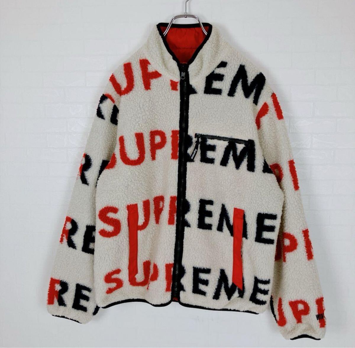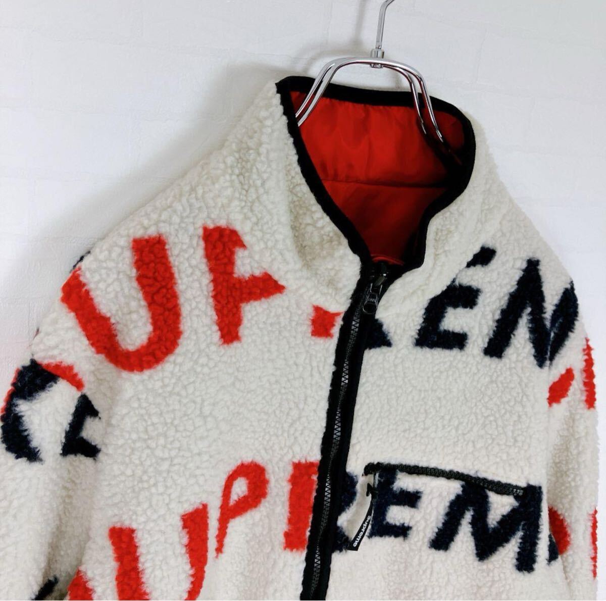 SUPREMEのロゴをたくさんあしらったデザインにボア素材の温かみのあるつくりで、リバーシブルになっていて裏面はボックスロゴのあるシンプルなデザインの真っ赤なジャケットとなっております。