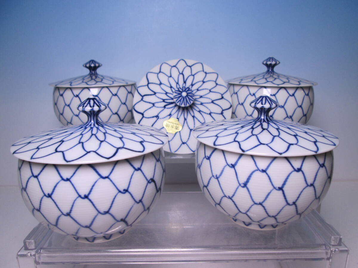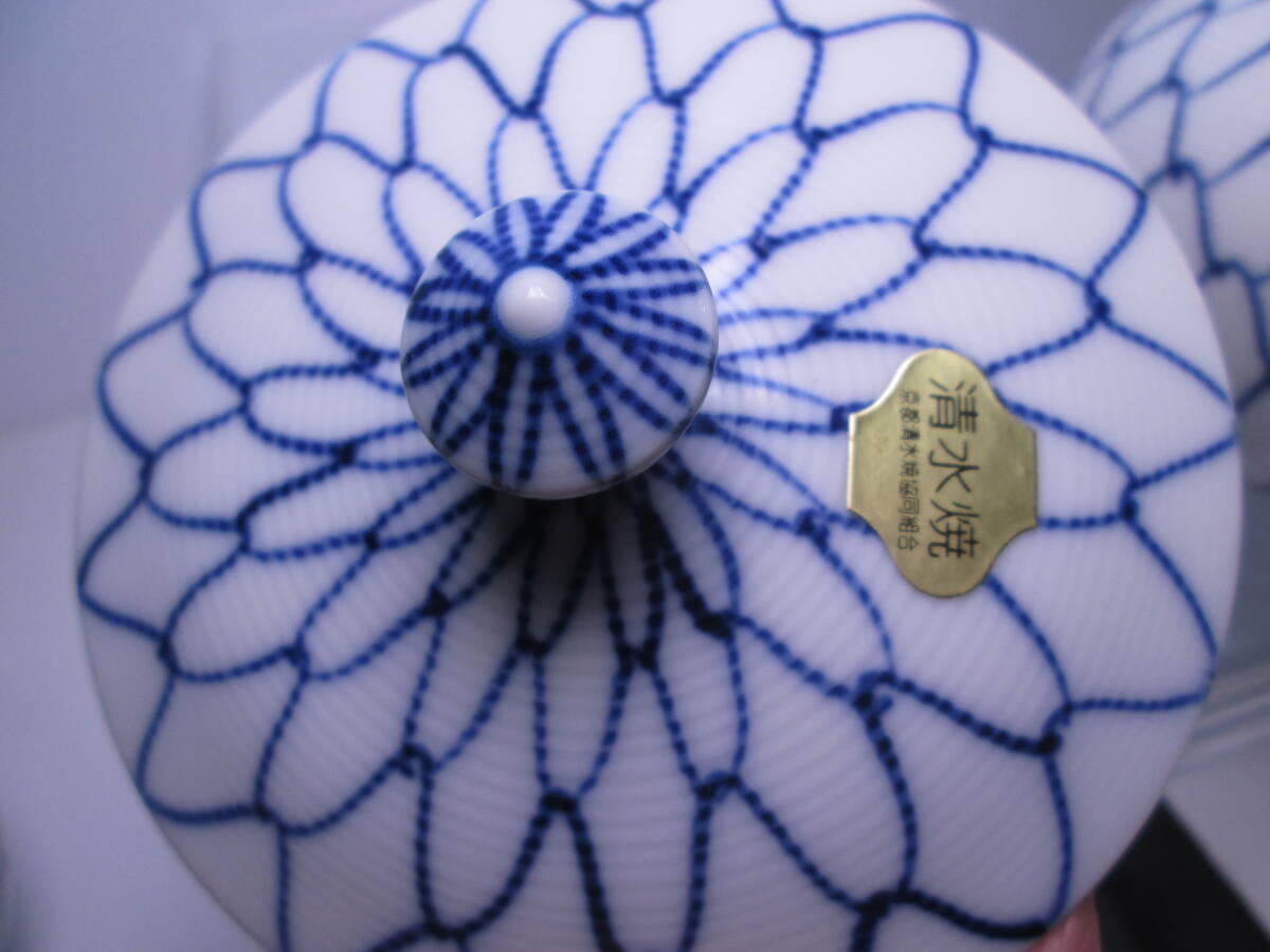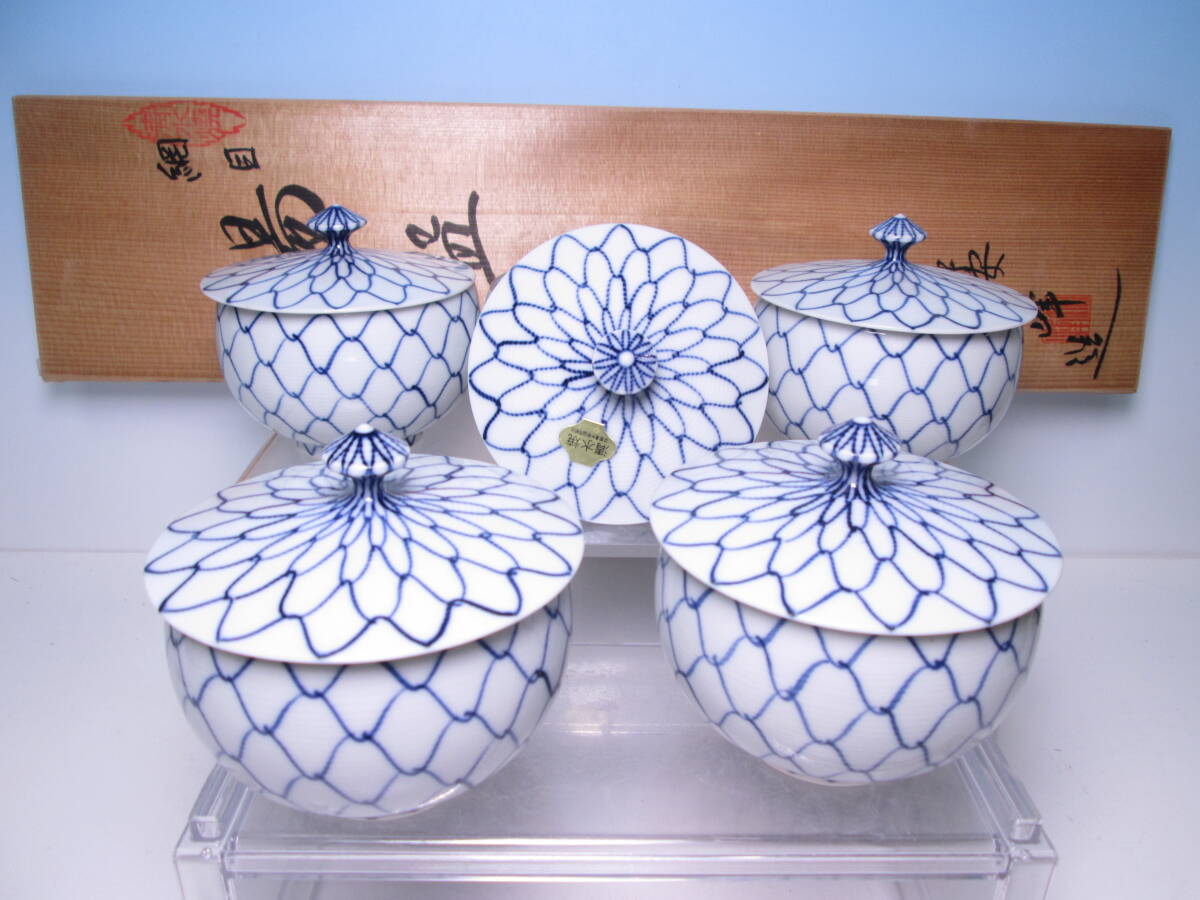 ☆お料理屋さんの器 平安 竹峰造 染付 網目文 蓋碗 五客 共箱 清水焼蓋付汲出碗/懐石割烹日本料理