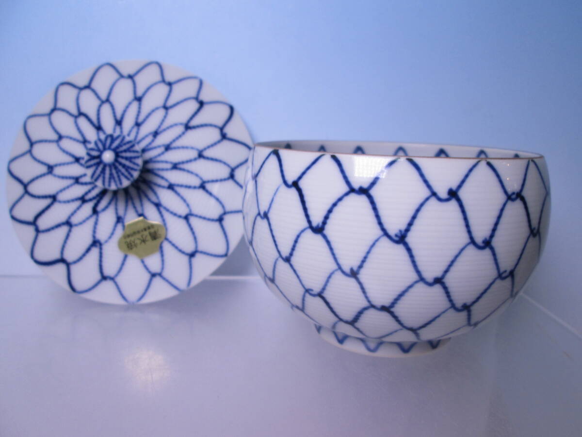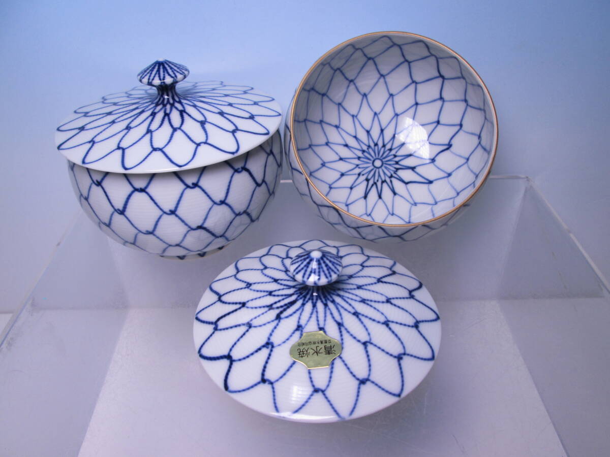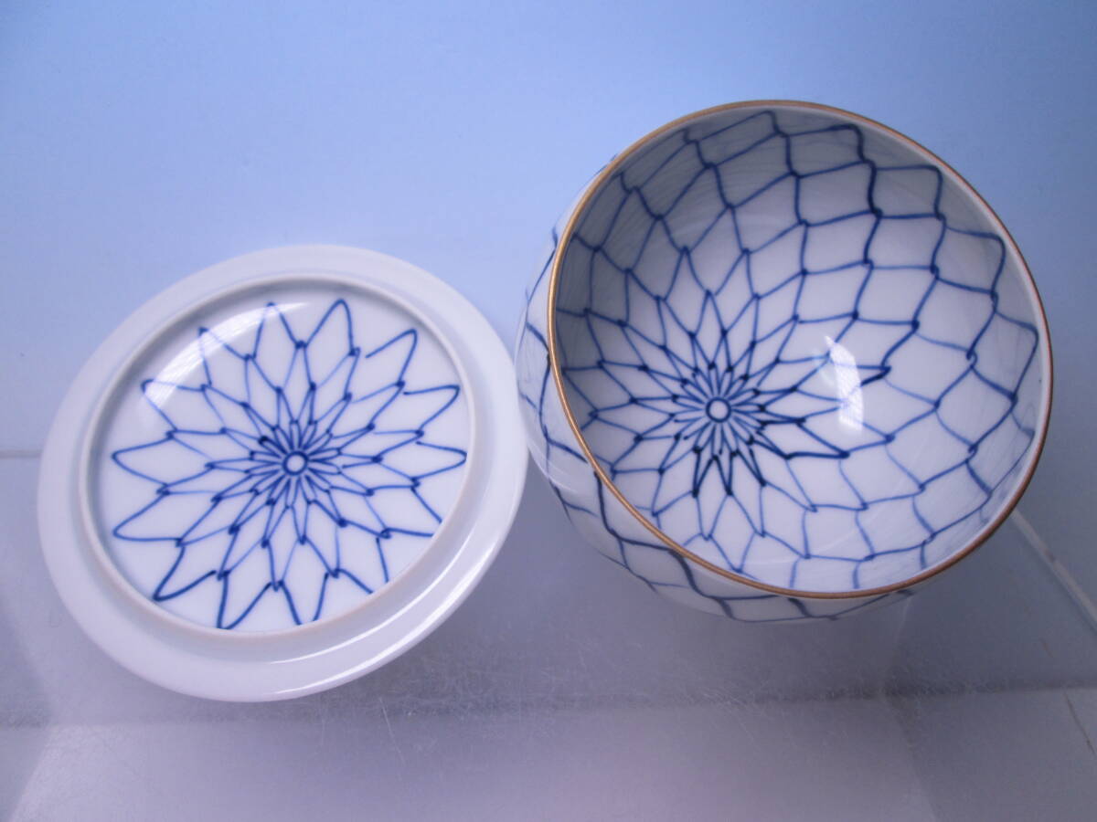 ☆お料理屋さんの器 平安 竹峰造 染付 網目文 蓋碗 五客 共箱 清水焼蓋付汲出碗/懐石割烹日本料理
