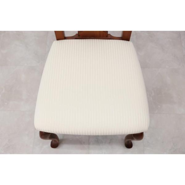 優しい木肌のマホガニー材を使用して滑らかな曲線に削り出した猫脚スタイル。ミディアムブラウンの明るく上品な色合いとフォルムが魅力のクラシカルデザイン。 座はウレタンフォームにSバネとウェービングテープの構造で、弾力のあるしなやかな座り心地です。座面はアイボリーの細いストライプ柄のファブリックを張った、クィーンアン様式のエレガントなダイニングチェアです。