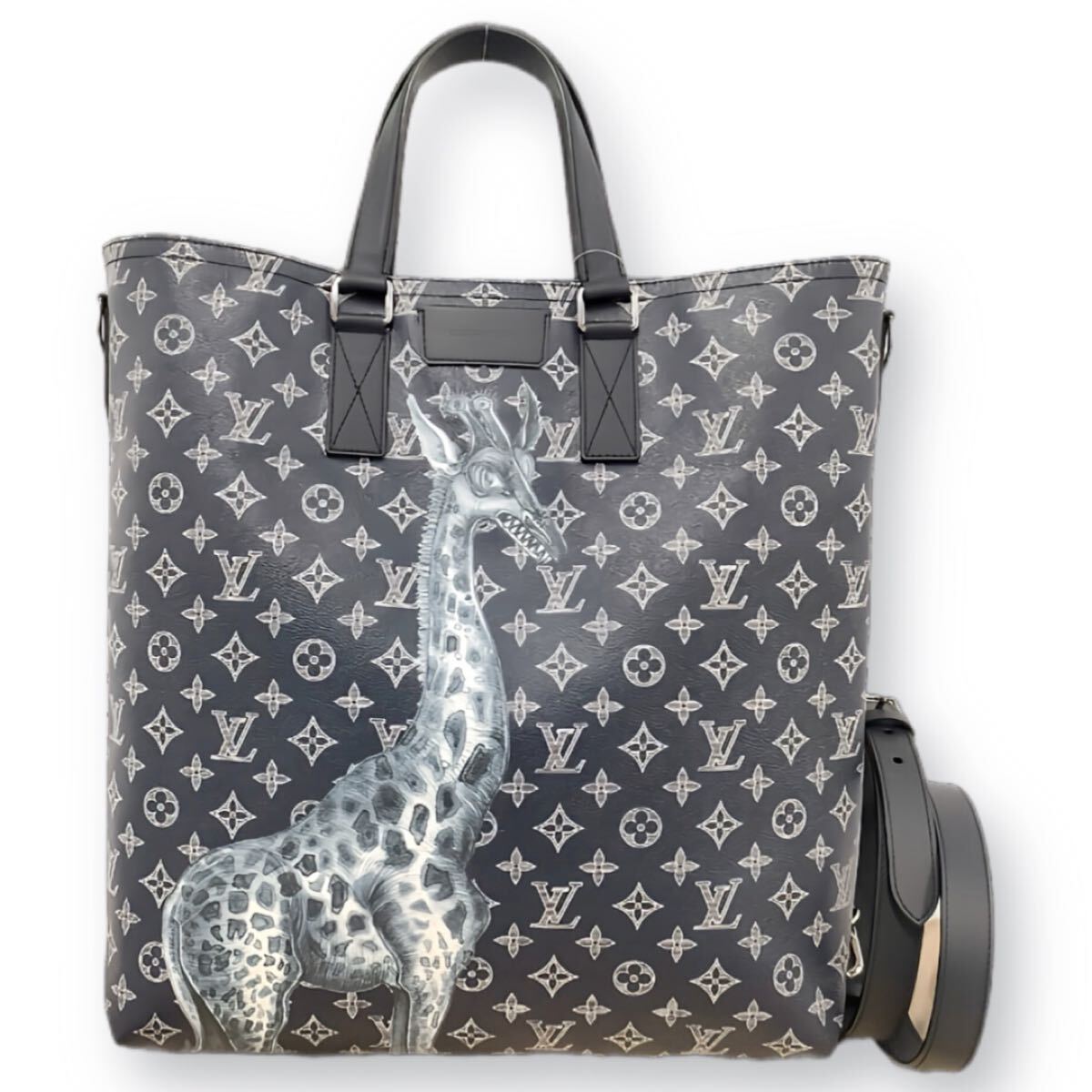 いかめしいタッチで描かれた動物、キリンのモチーフが印象的なトートバッグ。