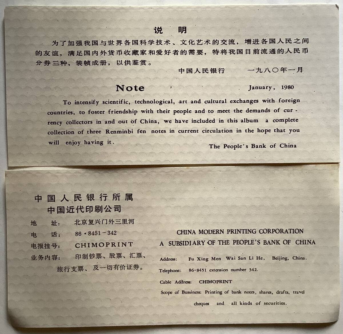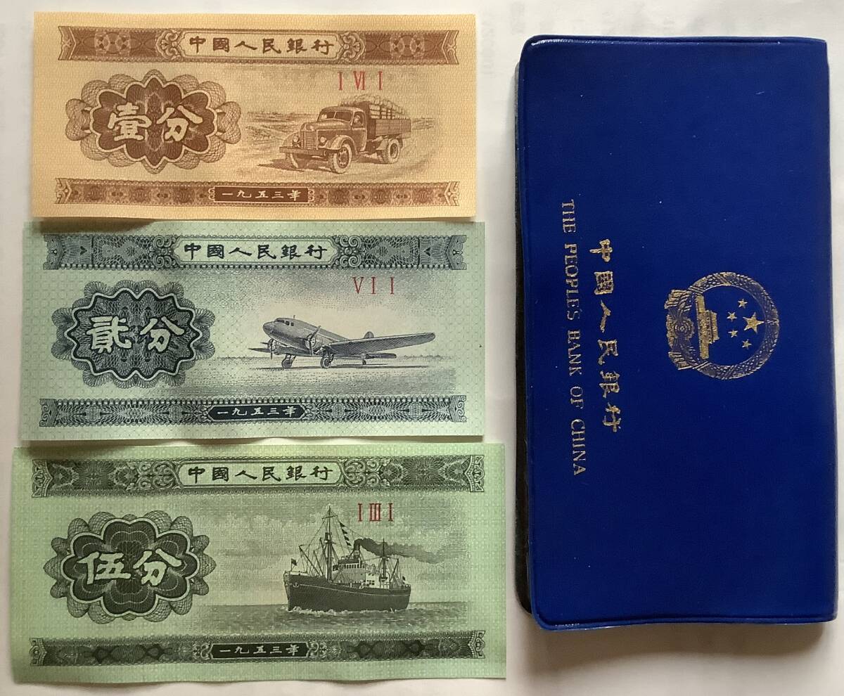 1980年、中国人民銀行が1979年銘の低額(1、2、5分)硬貨全量輸出用1万セットに合わせて、1953年銘低額(1、2、5分)紙幣1万セットを同じ材質、色合いのカバーに収め、硬貨セットと共に全量輸出した。この2種類のセットは中華人民共和国が初めて輸出した人民元になる。硬貨セットに関しては、1979年銘の硬貨が流通していないため価格が高騰する一方、紙幣セットはカバーで全量輸出用と判別でき、なかなか目にすることのできない幻の紙幣セットである。オリジナル説明書付き。