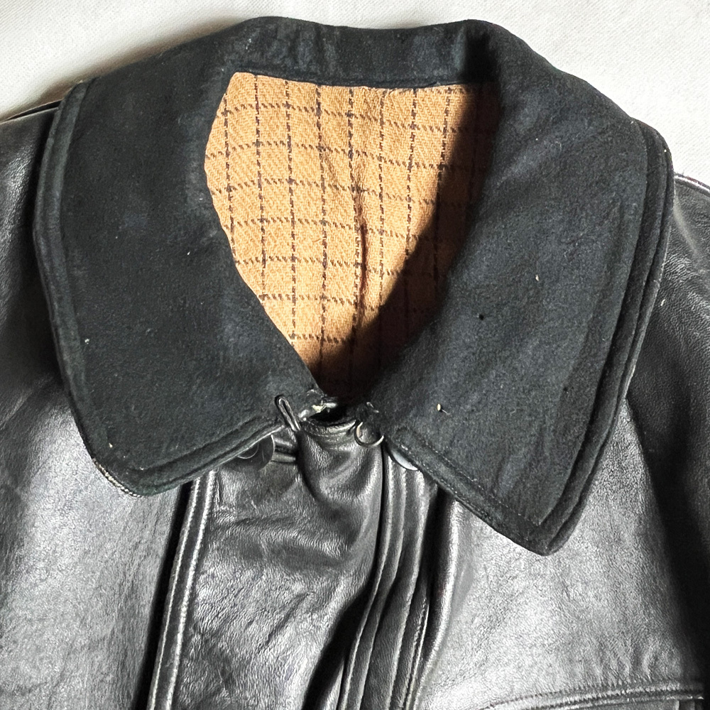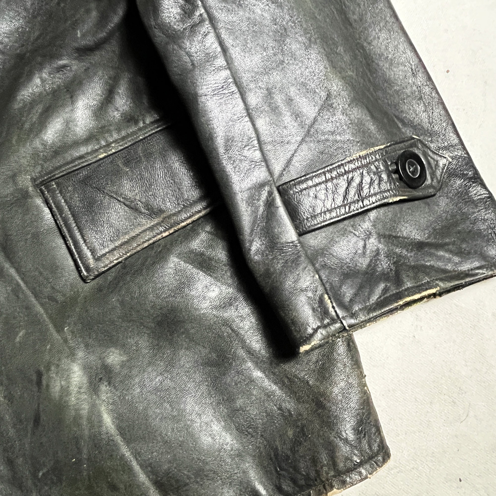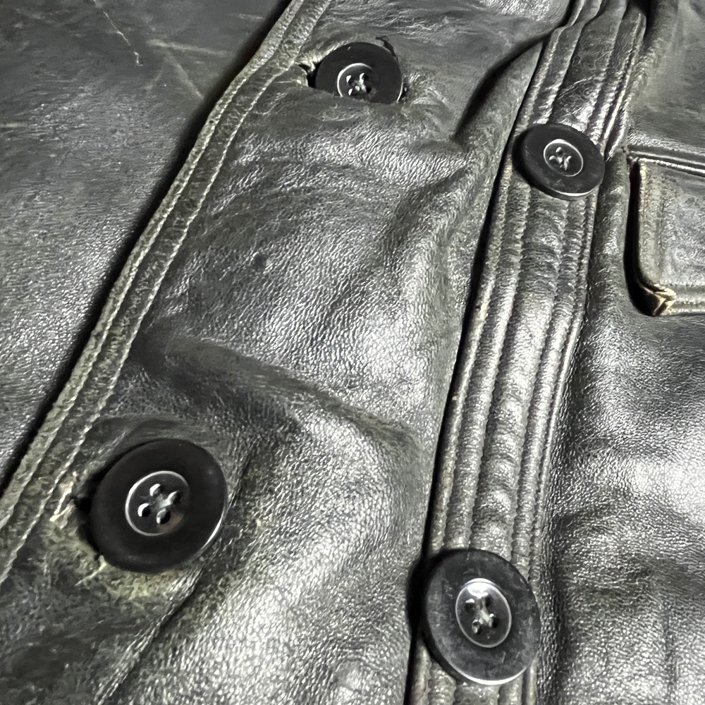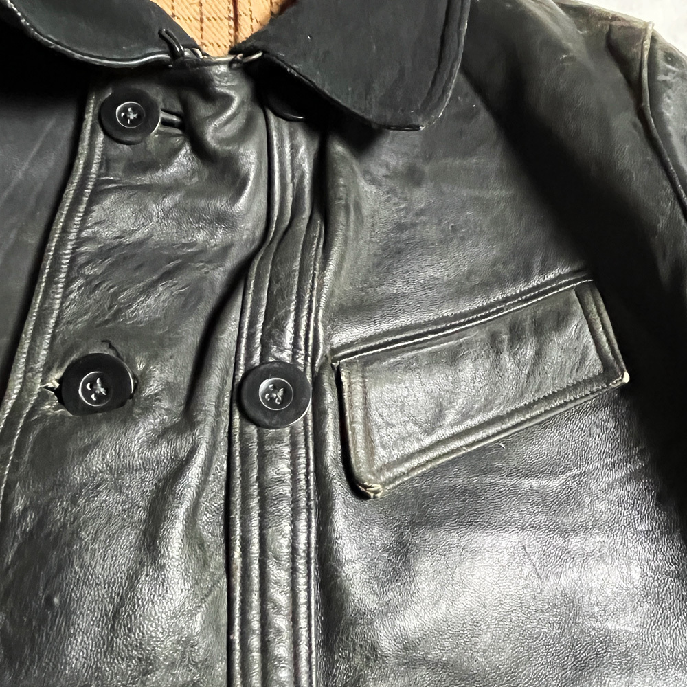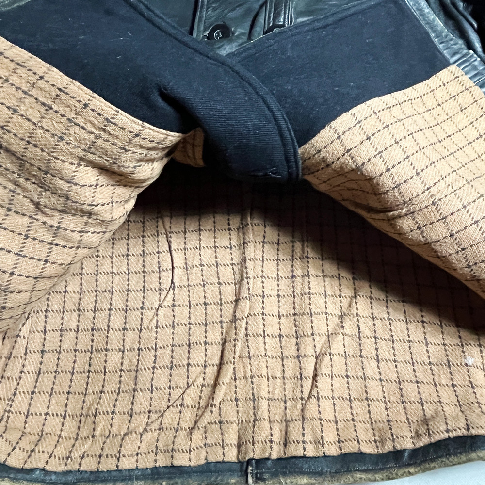 状態は全体的に若干のスレやレザー特有のフェード感、色ムラあり、襟ウール部分に小さな虫食い跡あり、裾や袖口、フラップにスレや小傷あり、チンストラップが欠損ですが、まだまだ現役で活躍可能なグッドコンディションです!