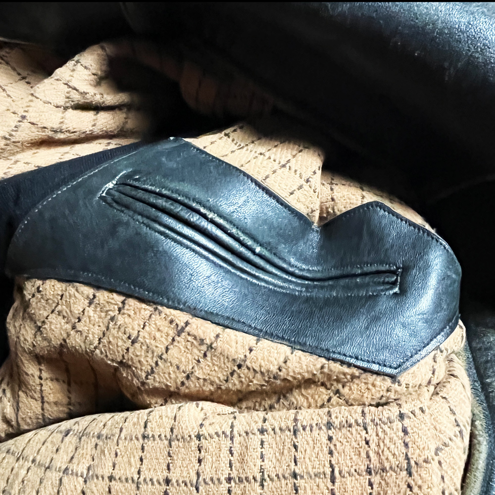 しかもこちらの様に、襟部分が同色のウール素材になっているタイプは、コルビジェ本人が着用していたとされる個体に酷似しております。通常、レザー襟の個体は大多数を占めており、ウール襟タイプは一握りしか存在しない、非常に球数の少ないディテールです。こちらは更に前立ての裏部分も襟と同じウール素材になっています。