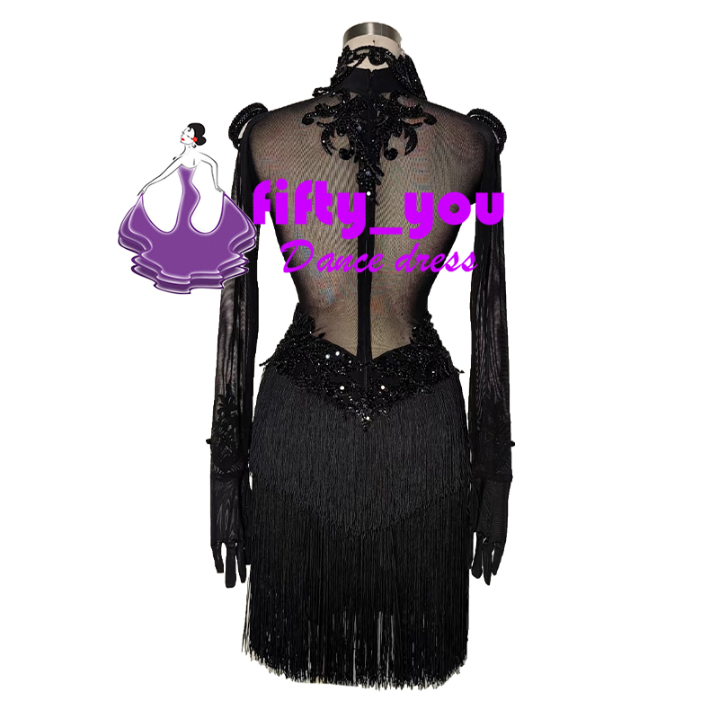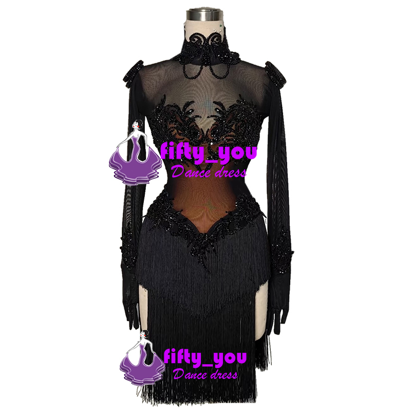 新品fifty_you レディース社交ダンスラテン衣装 サイズセミオーダー ラテン競技試合ドレス センスが良いデザイン 黒色 フリンジ飾り