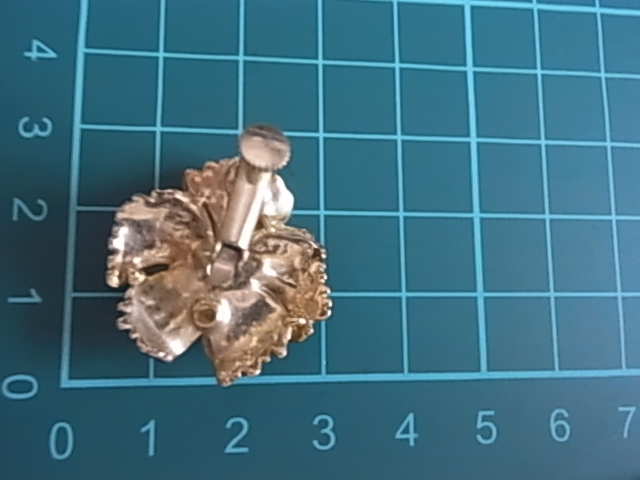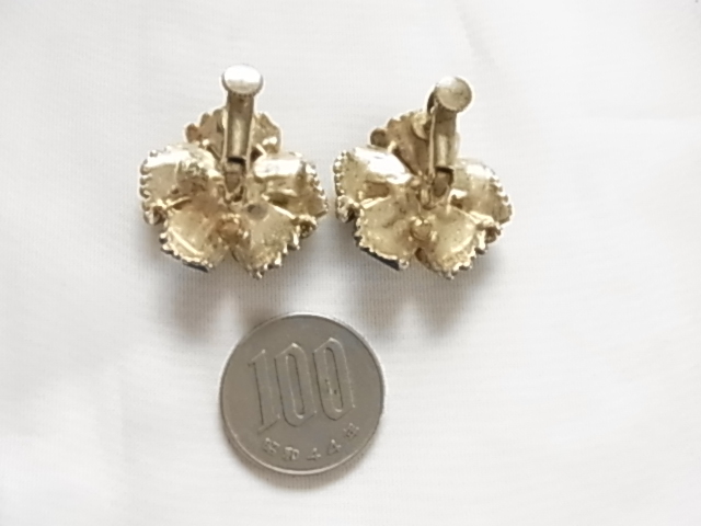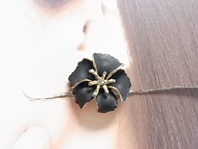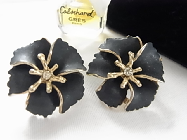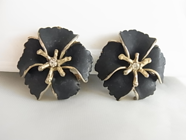 ★ビンテージ/ヴィンテージ 艶消しの墨色トーンの5弁のお花 フラワーモチーフ クリアラインストーンが中央に輝く 素敵なイヤリング
